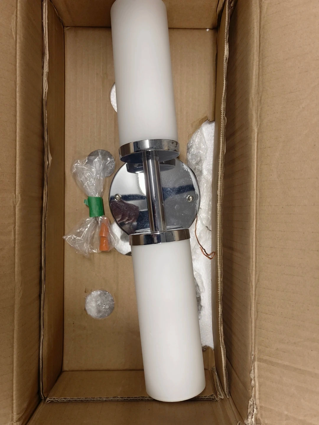 This is a double vanity light fixture with frosted glass shades. It's made with a chrome finish. Includes mounting hardware. Perfect for bathrooms or hallways!