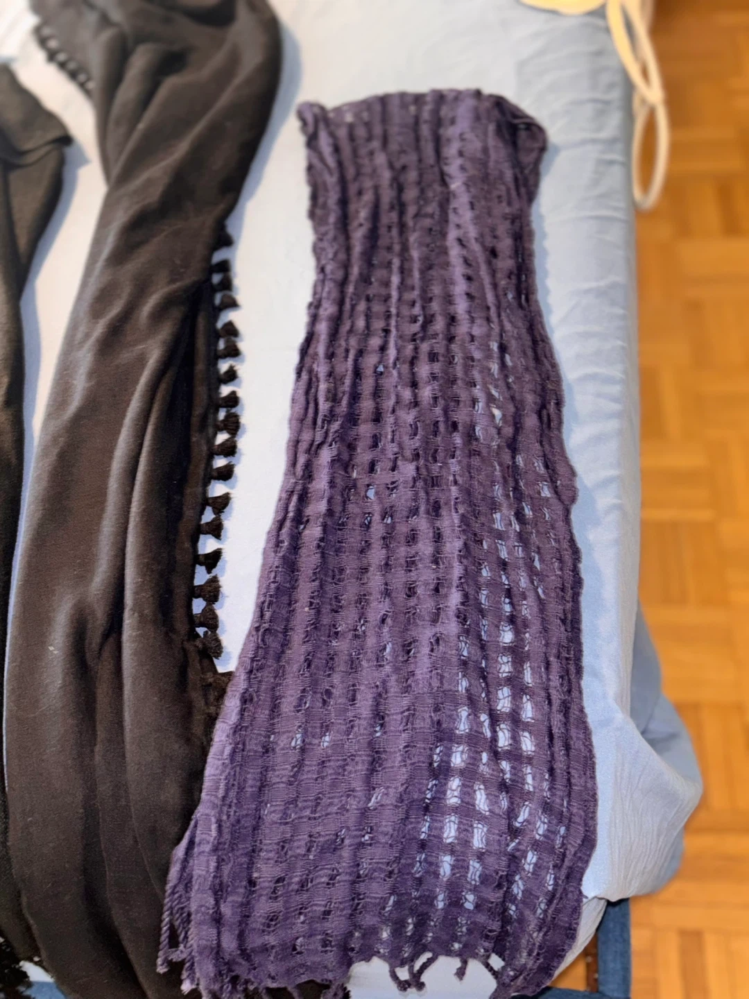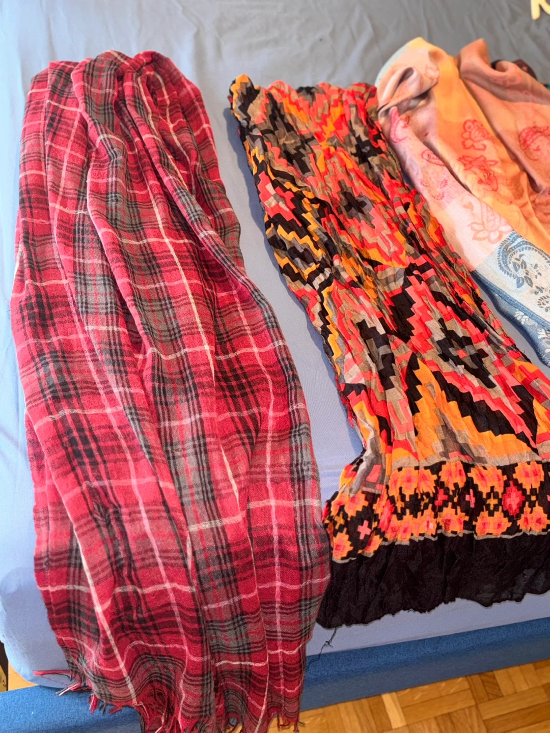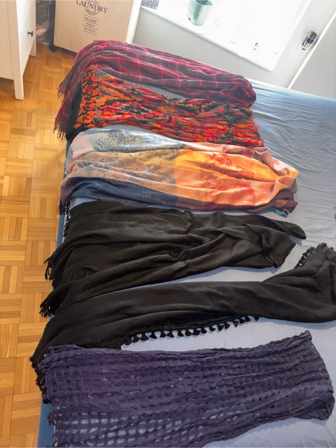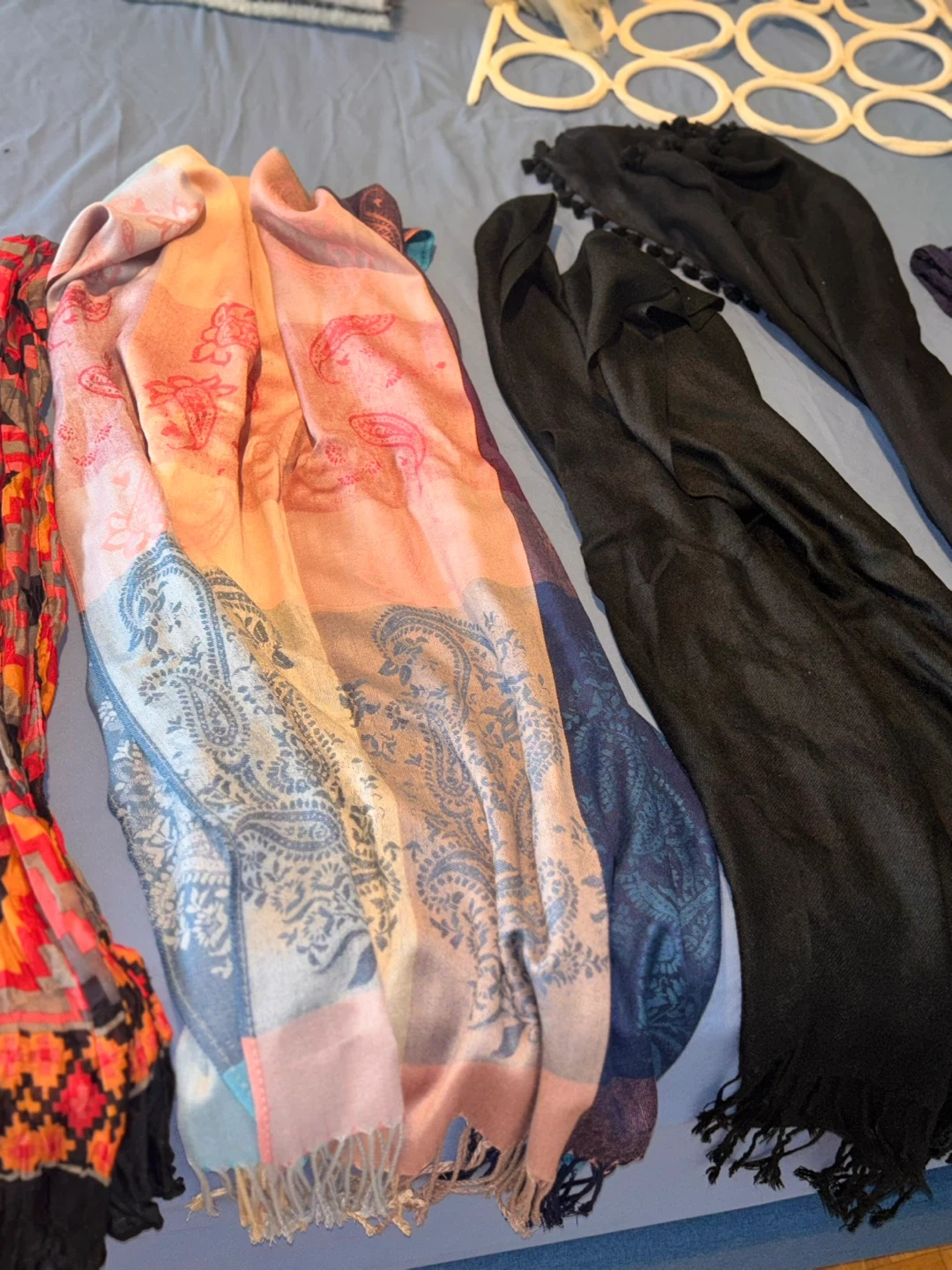 Collection of women's scarves in various colours and patterns. Includes plaid, paisley, and textured styles, many with fringe or tassel details. Adds a touch of flair to any outfit!