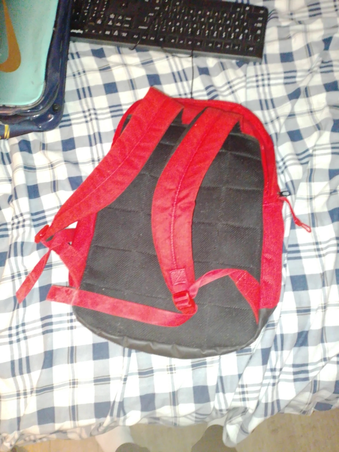 This is a red Nike backpack. It has a zippered main compartment and a mesh side pocket. The adjustable padded shoulder straps make it comfy to wear.