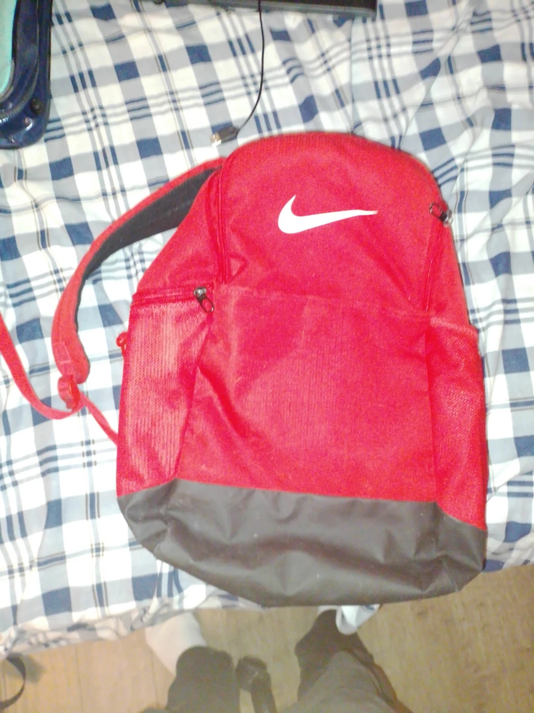 This is a red Nike backpack. It has a zippered main compartment and a mesh side pocket. The adjustable padded shoulder straps make it comfy to wear.