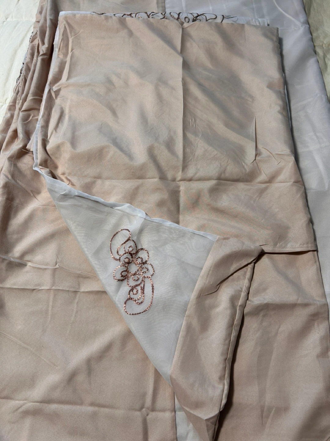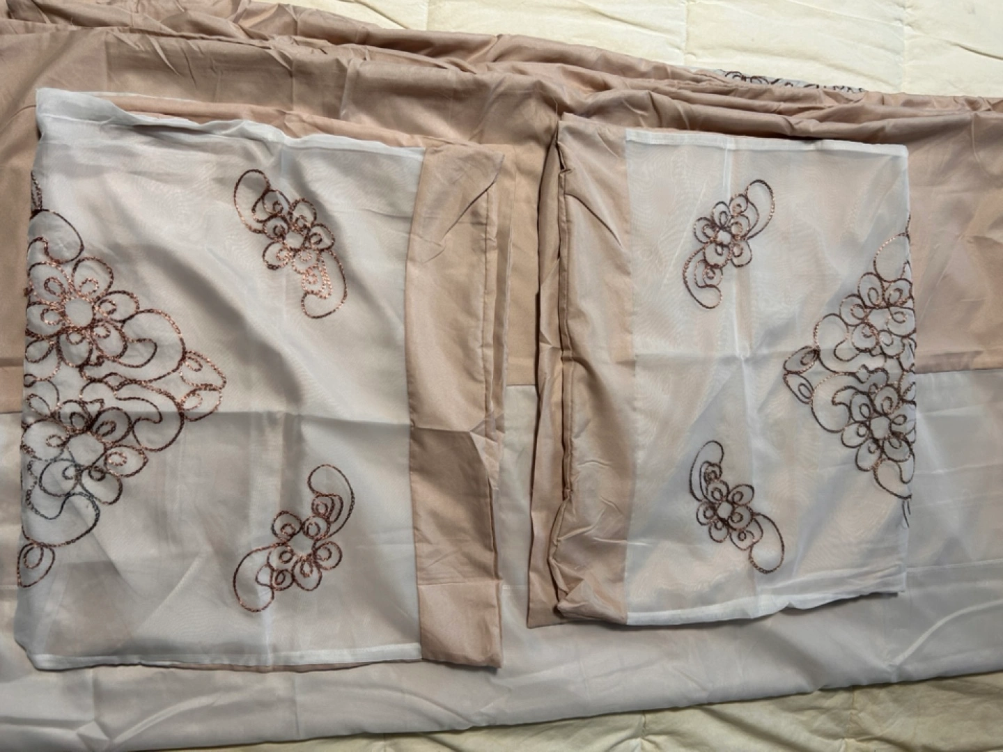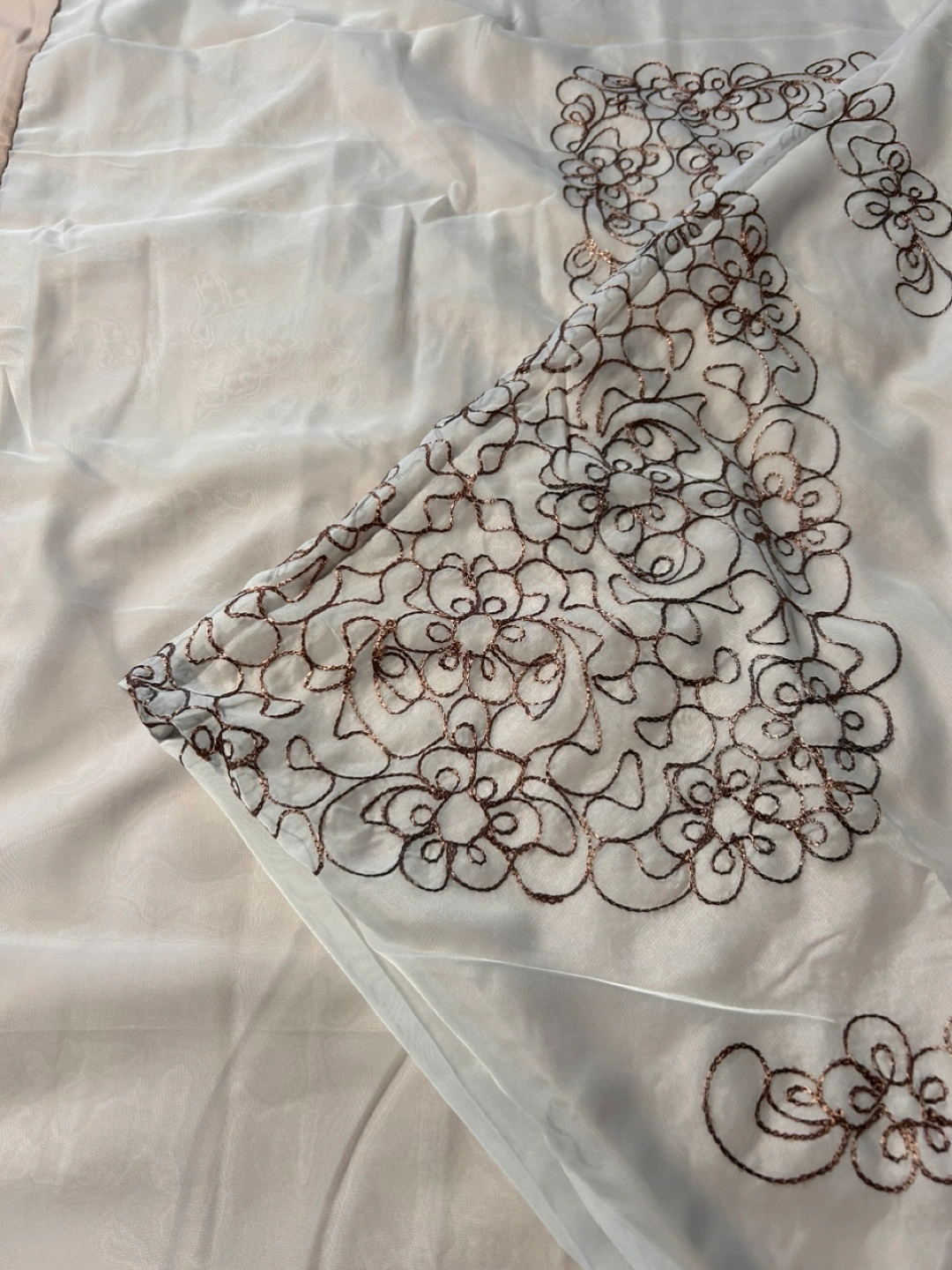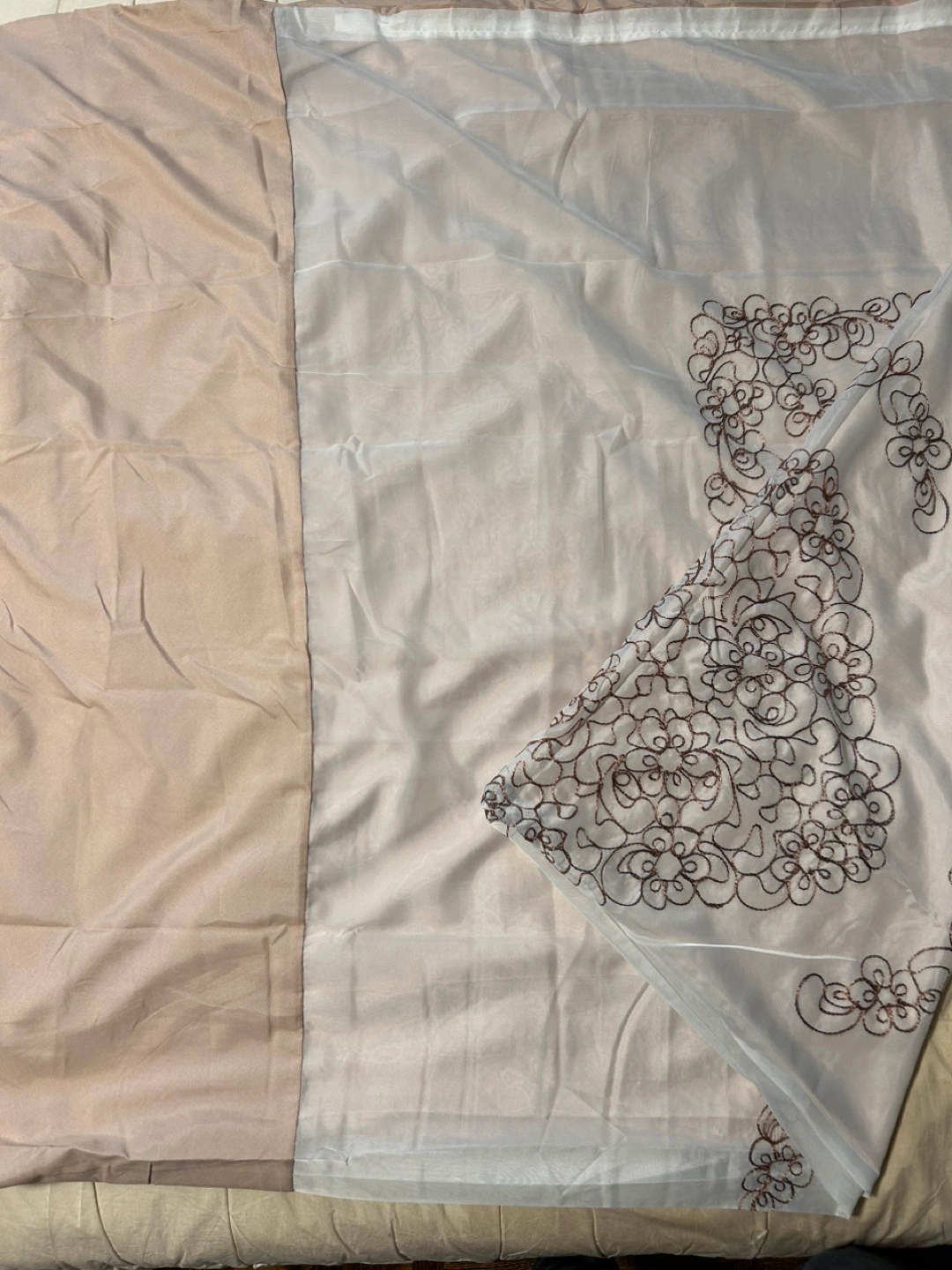 Includes 1 double sided sheet hollow sheet with solid bottom with organza with flower printed embroidery on top sewn together