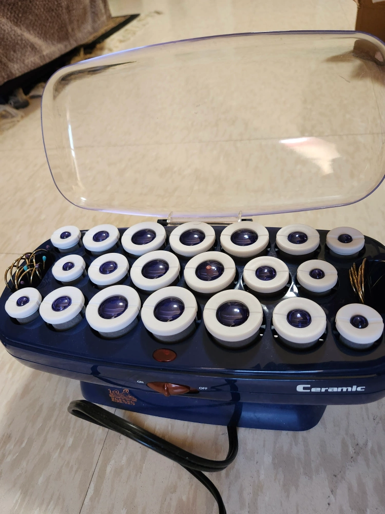 Electric hair rollers with a blue base and clear lid, with 20 white rollers. For medium and long hair.Used maybe once or twice.