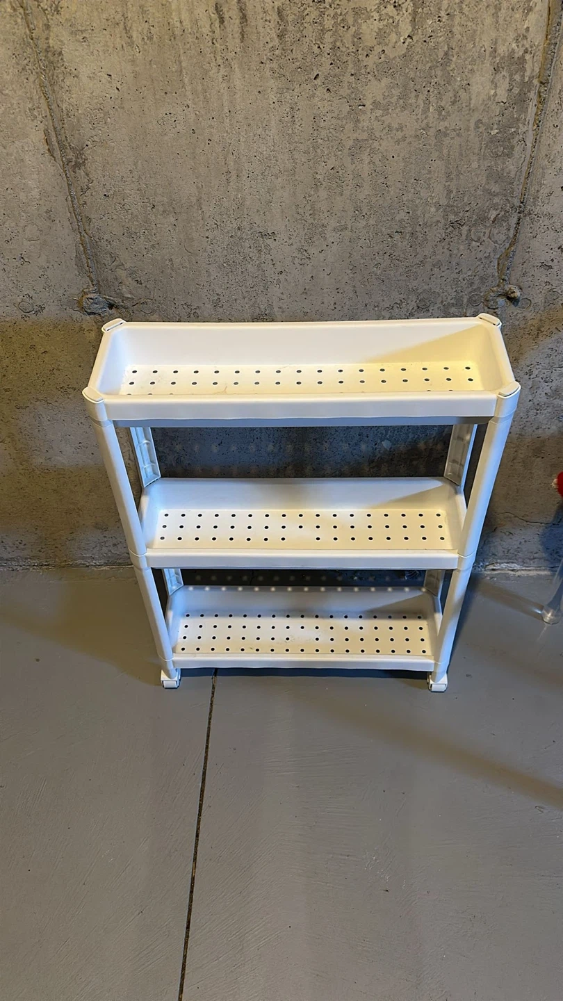 This white 3-tier plastic storage shelf is handy for organizing items. It's made of durable plastic and features perforated shelves. This shelf would be useful in a bathroom, laundry room, or garage for small item storage.