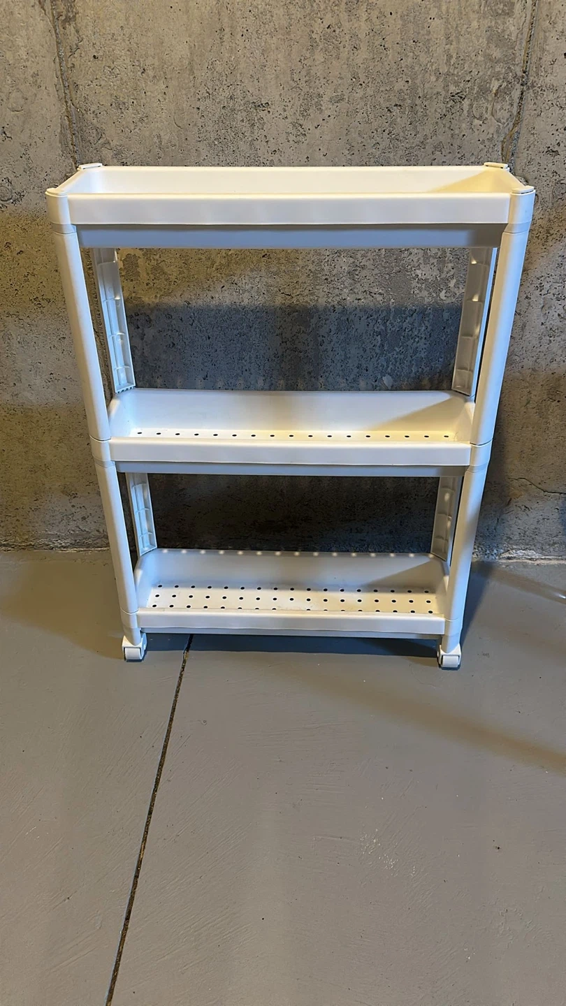This white 3-tier plastic storage shelf is handy for organizing items. It's made of durable plastic and features perforated shelves. This shelf would be useful in a bathroom, laundry room, or garage for small item storage.