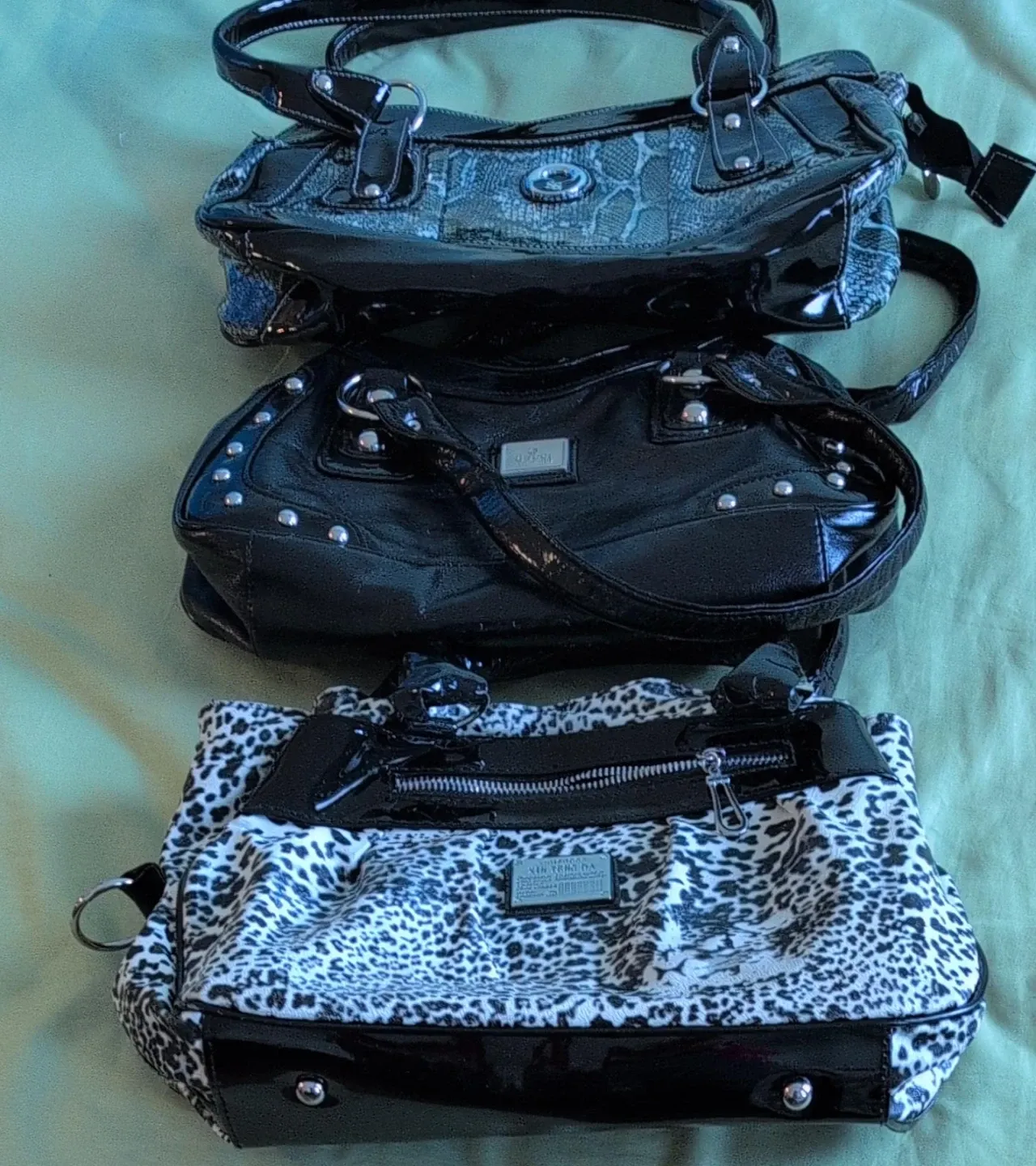 Selling three women's handbags. Includes a black patent and snakeskin print purse, a black studded purse, and a leopard print and black patent purse. All are medium-sized. Pick up 3for 30 dollars