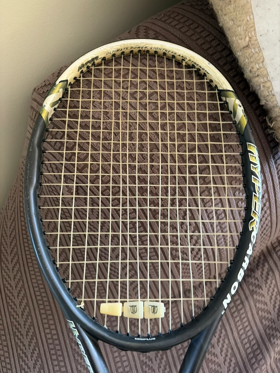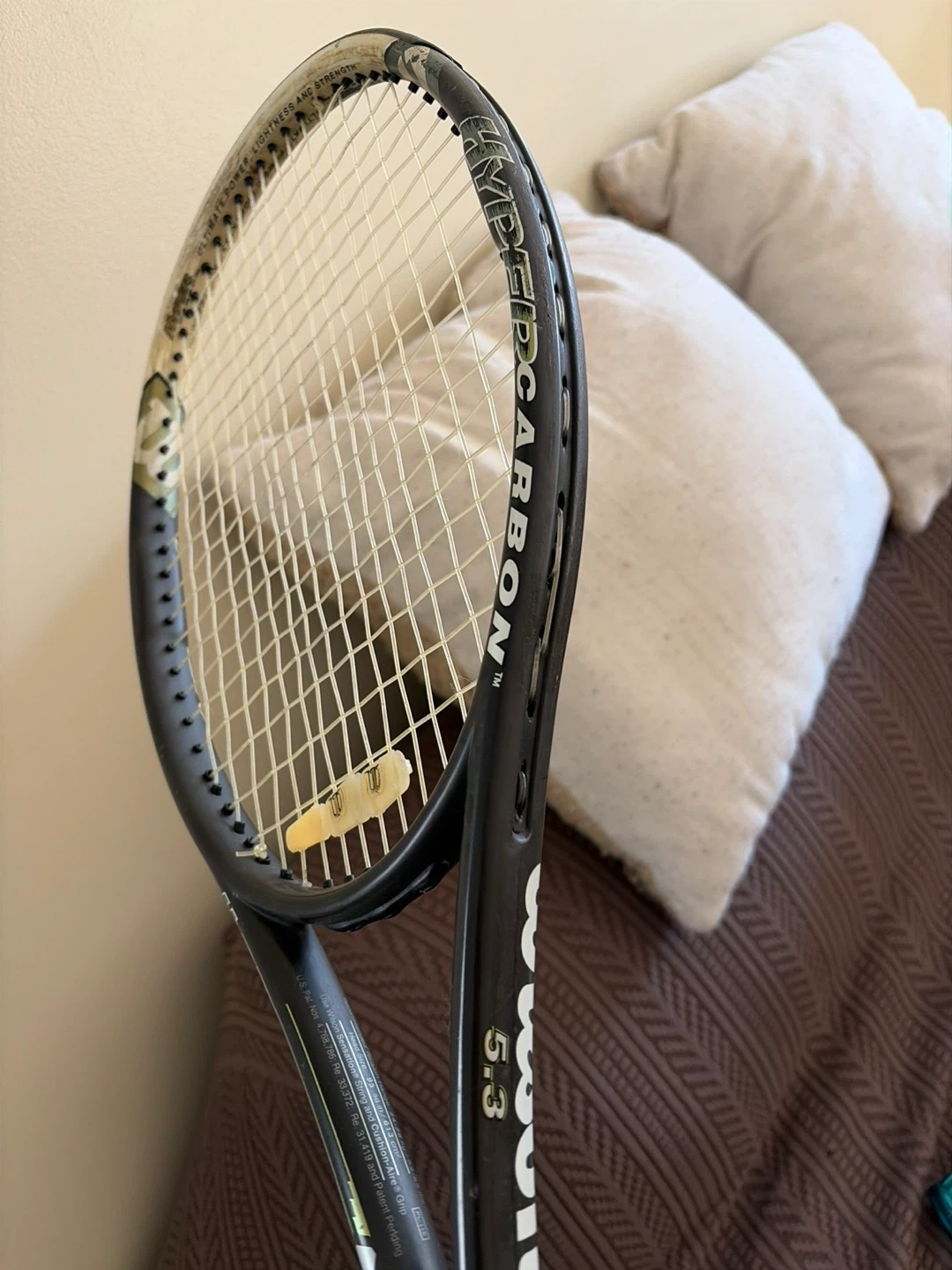 Wilson tennis racket with Hyper Carbon 5.3 construction. It's a midplus size racket. It's in used condition with some wear on the grip. Great for recreational players!