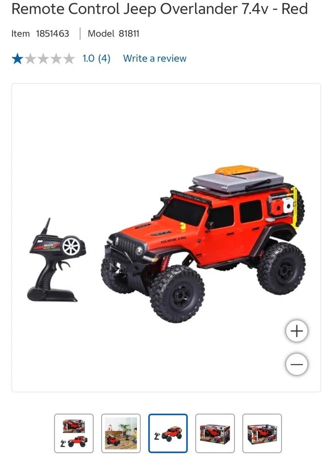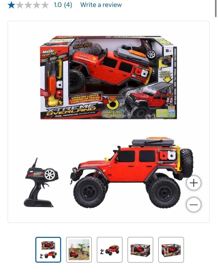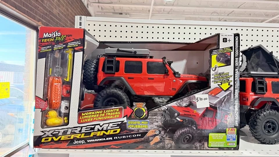 Maisto Tech RC Jeep Wrangler Rubicon Red – Xtreme Overland Series off-road truck. Price: $70.00. Features functional working lights and is designed for off-road use. This is a 1:16 scale remote control vehicle, approximately 19 inches in size. Features 2.4GHz for up to 4 vehicles at once, a 35m (115 ft) range, speeds up to 6.4 km/h (4 MPH), and 4x4 Drive.