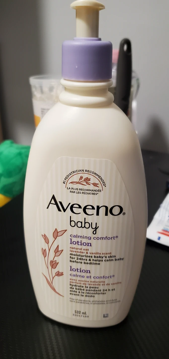 Aveeno Baby Calming Comfort Lotion with natural oat, lavender & vanilla scent. Moisturizes baby's skin for 24 hours and helps calm baby before bedtime. Free of parabens, phthalates and dyes. 532 mL bottle.