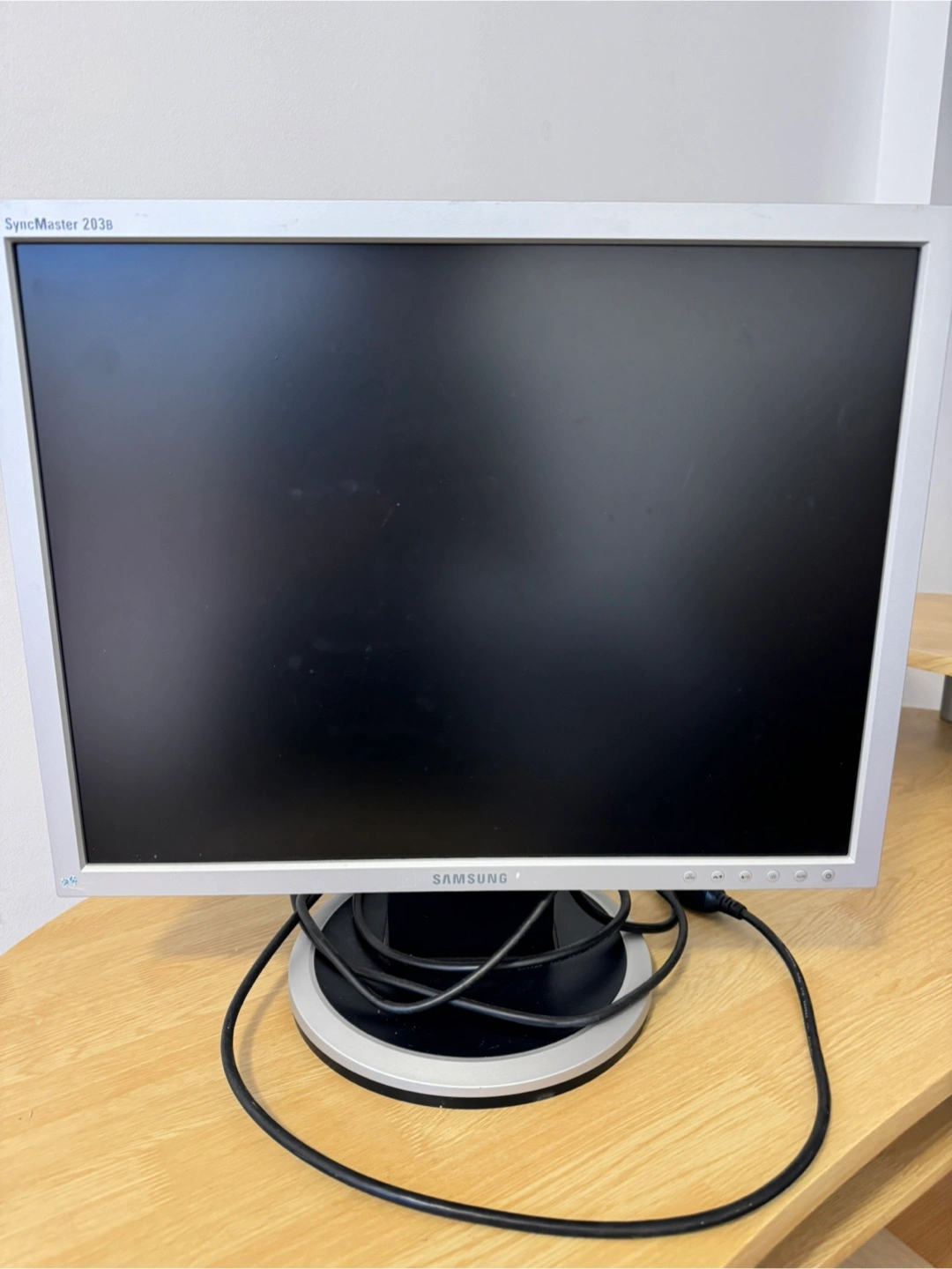 A desktop monitor with a silver bezel. It sits on a circular stand. Features several ports, and a power cable. A great monitor for a home office setup.
