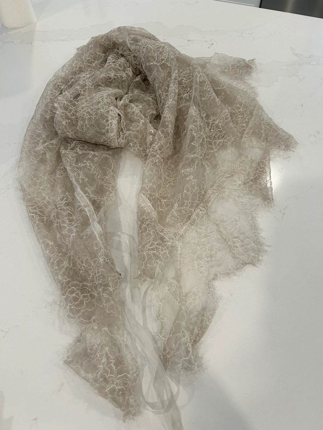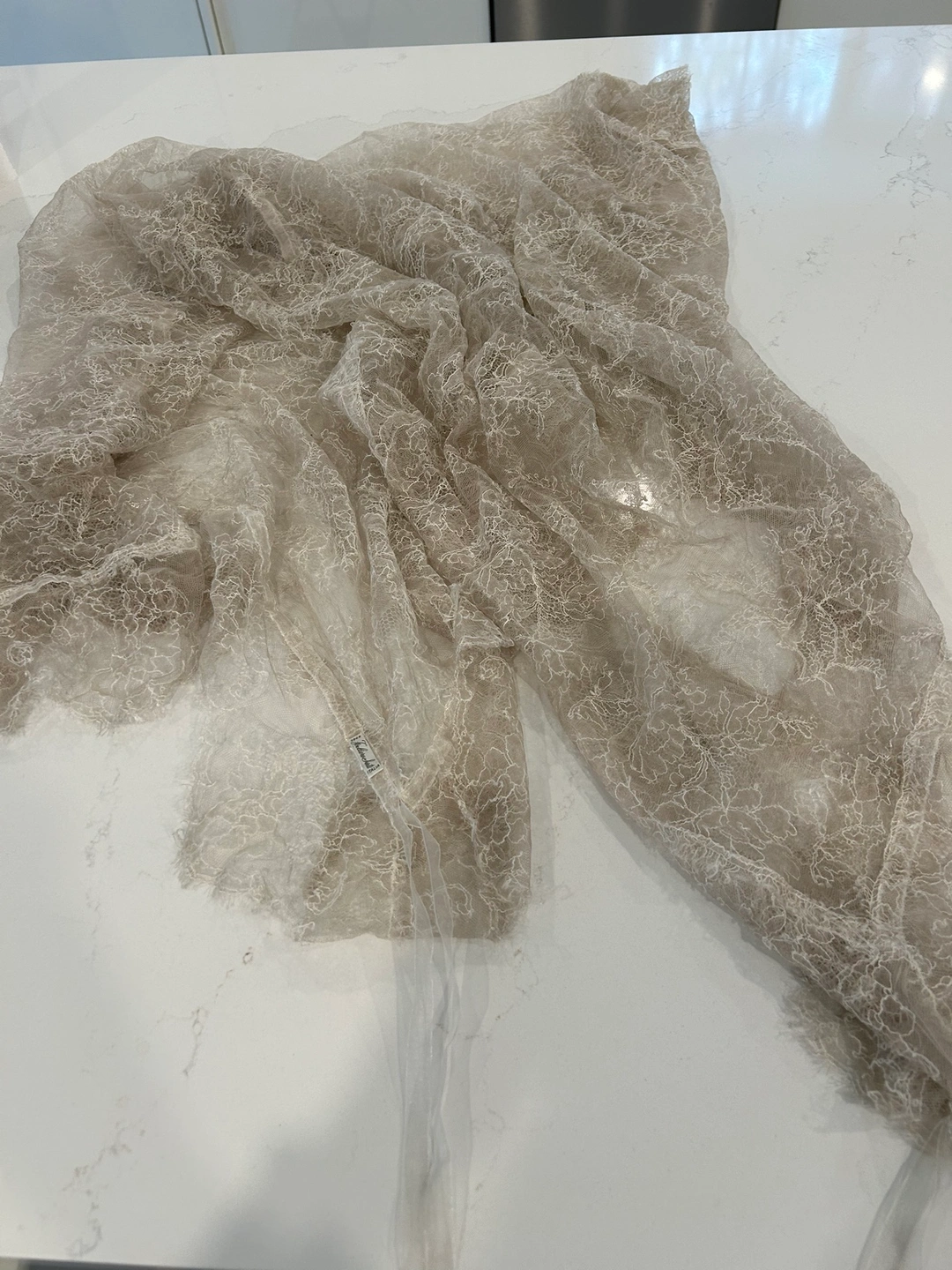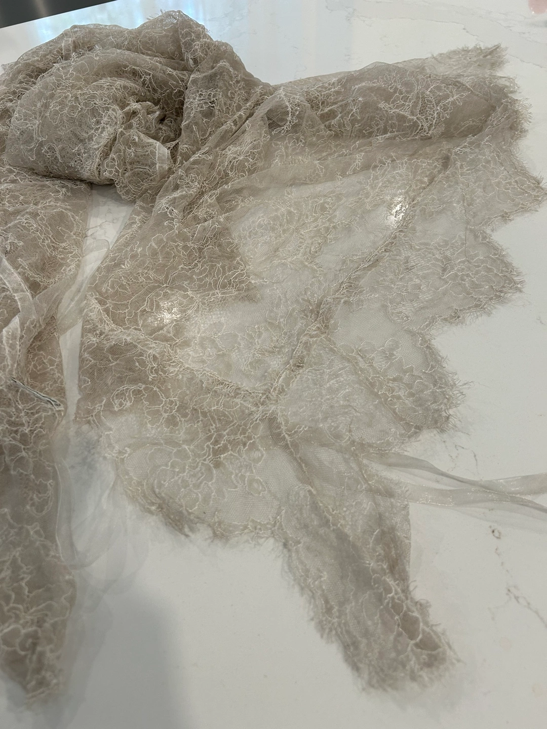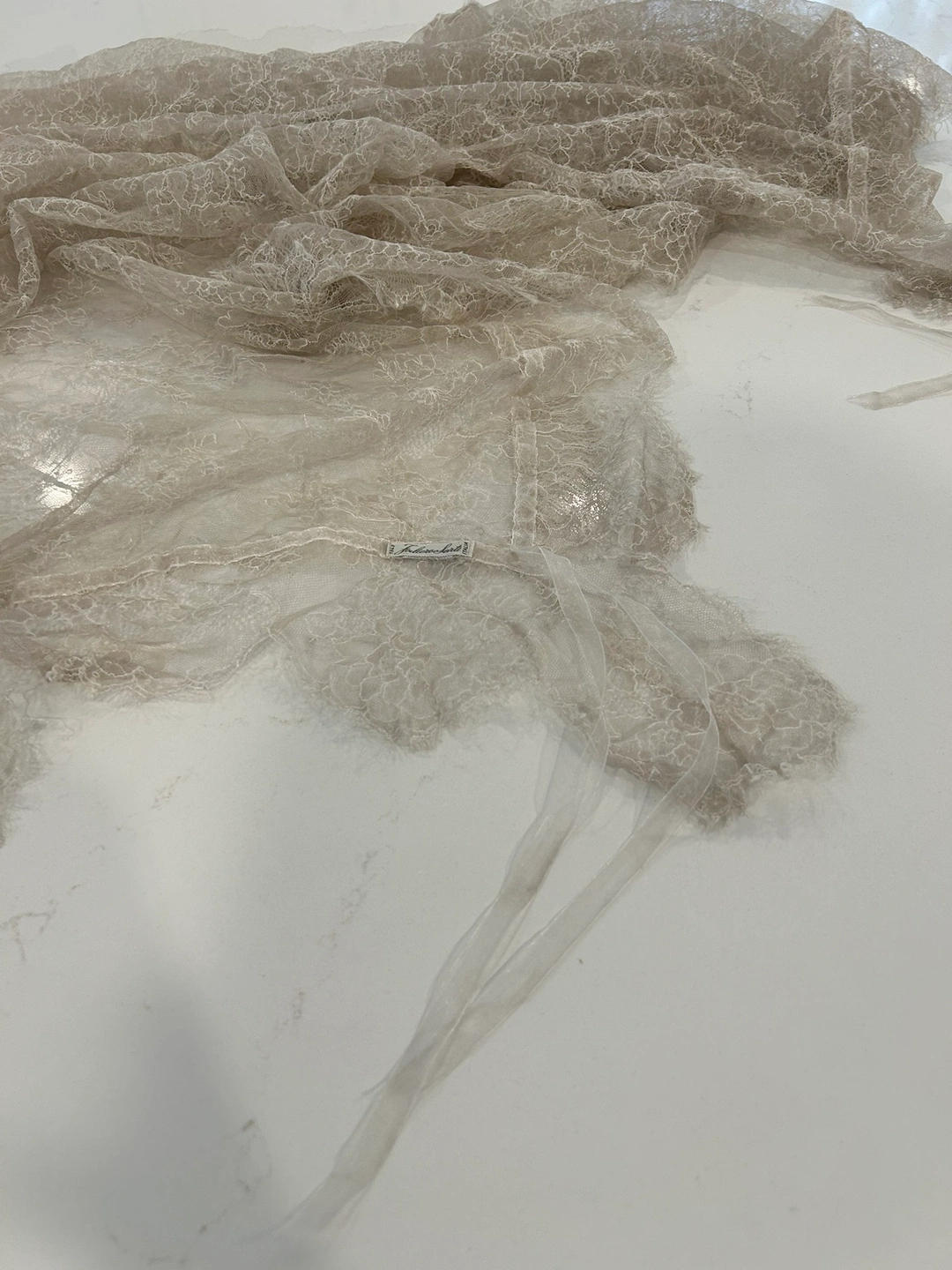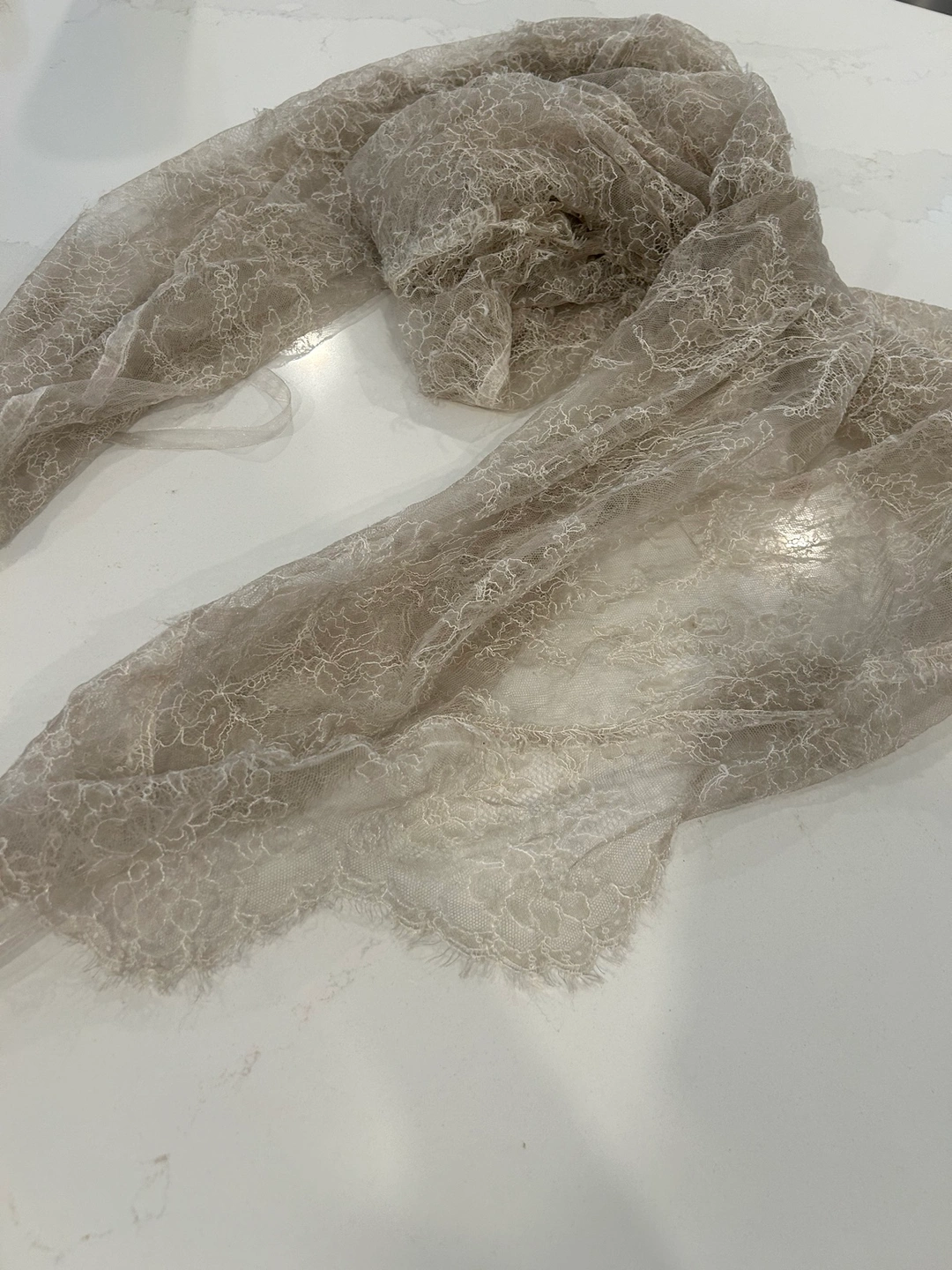 A delicate and beautiful light brown lace scarf. It is approximately 55 inches in length. It is sheer and soft. Made in Italy by "Fabrizio Conti". The lace is detailed and elegant. The ends have a delicate fringe. It is a classic accessory that can be worn with a variety of outfits.