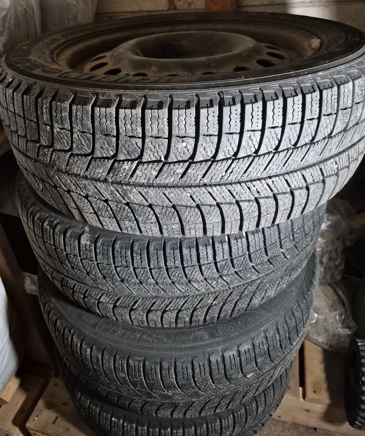 Four Michelin winter tires and rims.(My car is Acura TLX)Tires are black with a tread depth suitable for snowy conditions. These are 225/55R 17-inch tires.