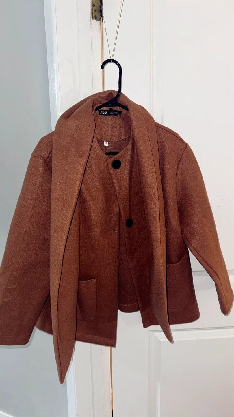 This stylish ZARA coat comes in a warm brown hue. It's a size S with two front pockets and a classic button-up closure. Made from a soft, cozy material, it's perfect for layering during cooler weather.