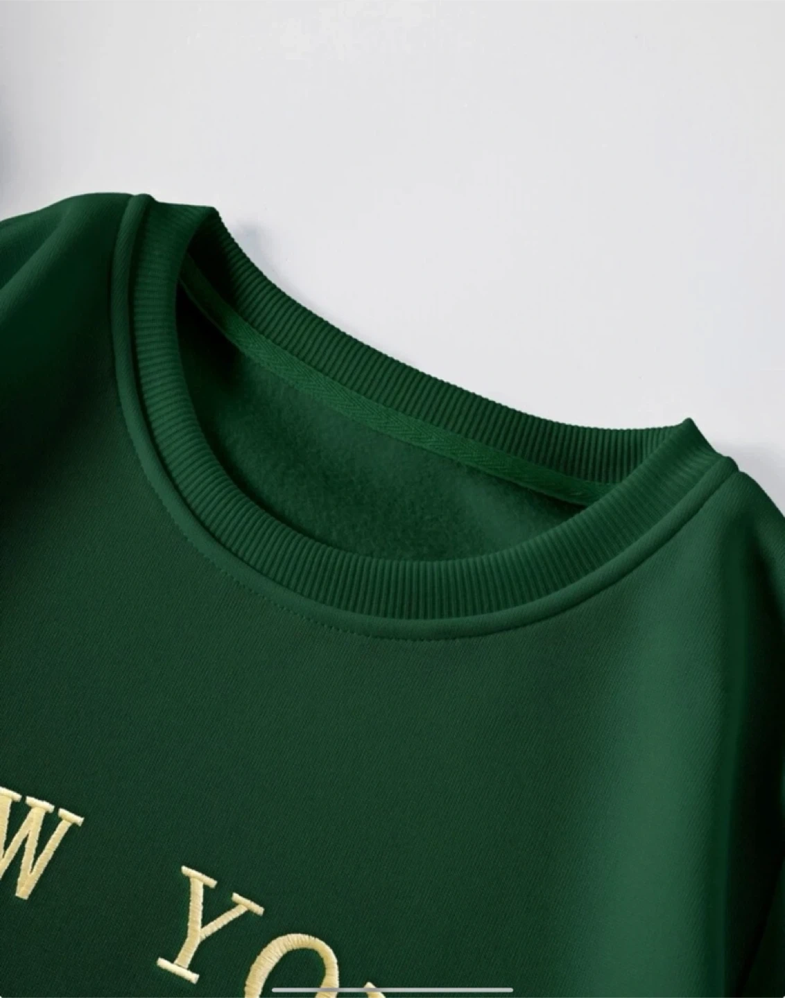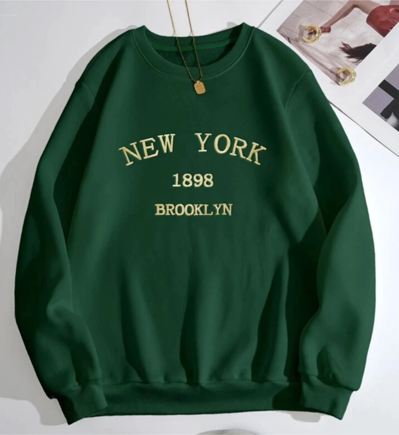 Crewneck sweatshirt in a deep green colour. It's printed with "New York 1898 Brooklyn" text on the front. This sweatshirt is made of a soft fabric blend.