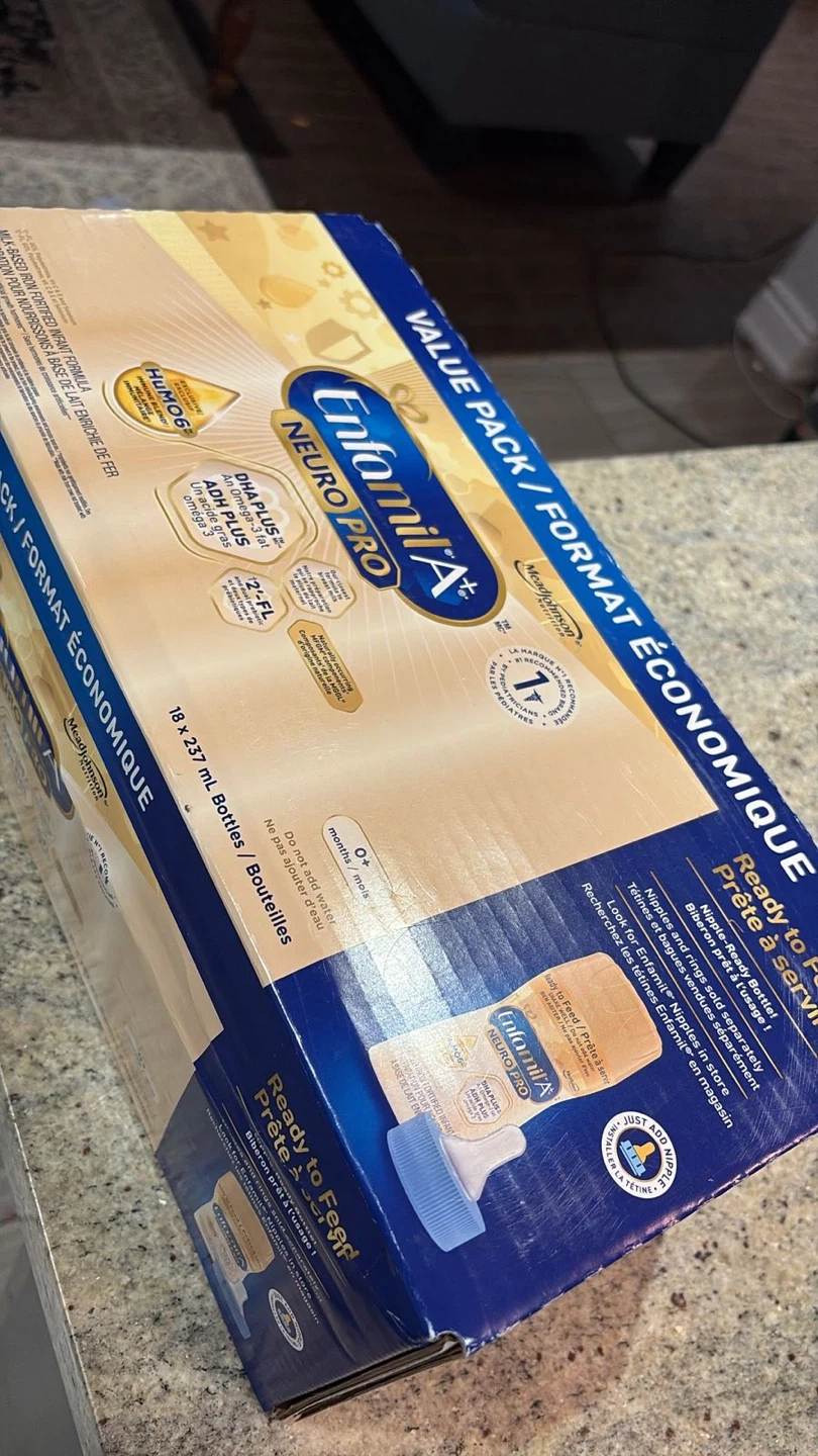 Enfamil A+ Neuro Pro infant formula value pack. Comes with 18 x 237 mL bottles. Formula is milk-based and iron-fortified. Ready-to-feed format, no water needed.