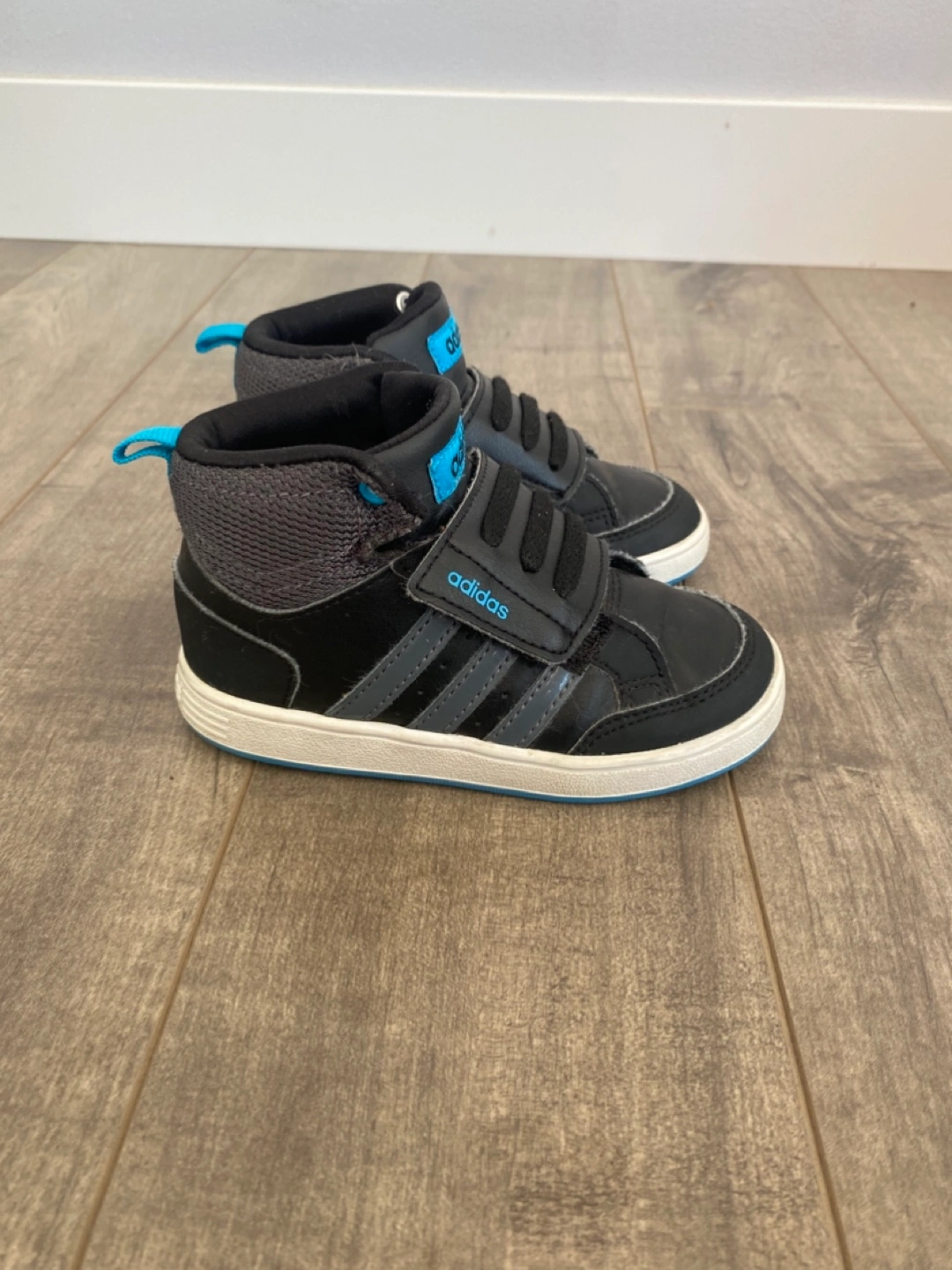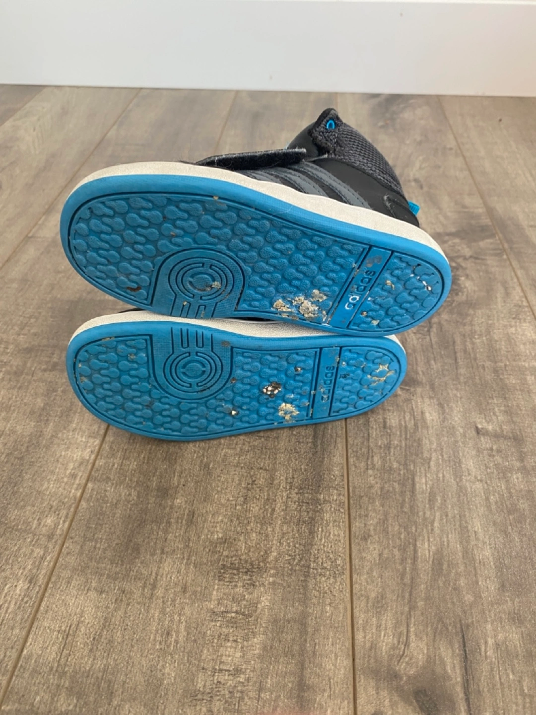Black and grey Adidas high-top sneakers with blue accents. These shoes have hook-and-loop closures for easy on and off. They're great for active kids!