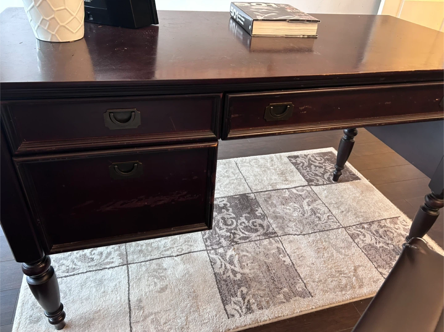 This is a dark wood writing desk with three drawers, including one file drawer. It's a sturdy desk that offers ample workspace. Perfect for a home office or study.