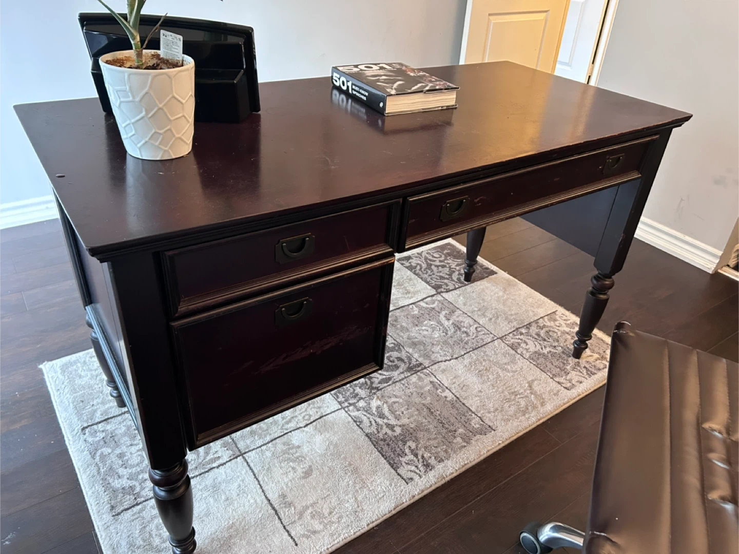 This is a dark wood writing desk with three drawers, including one file drawer. It's a sturdy desk that offers ample workspace. Perfect for a home office or study.