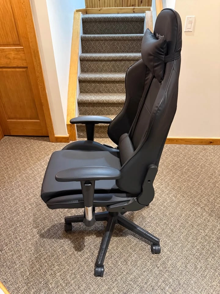 Features: Adjustable height, Reclining backrest, Includes headrest and lumbar support cushions, Smooth rolling wheels, Modern all-black design.