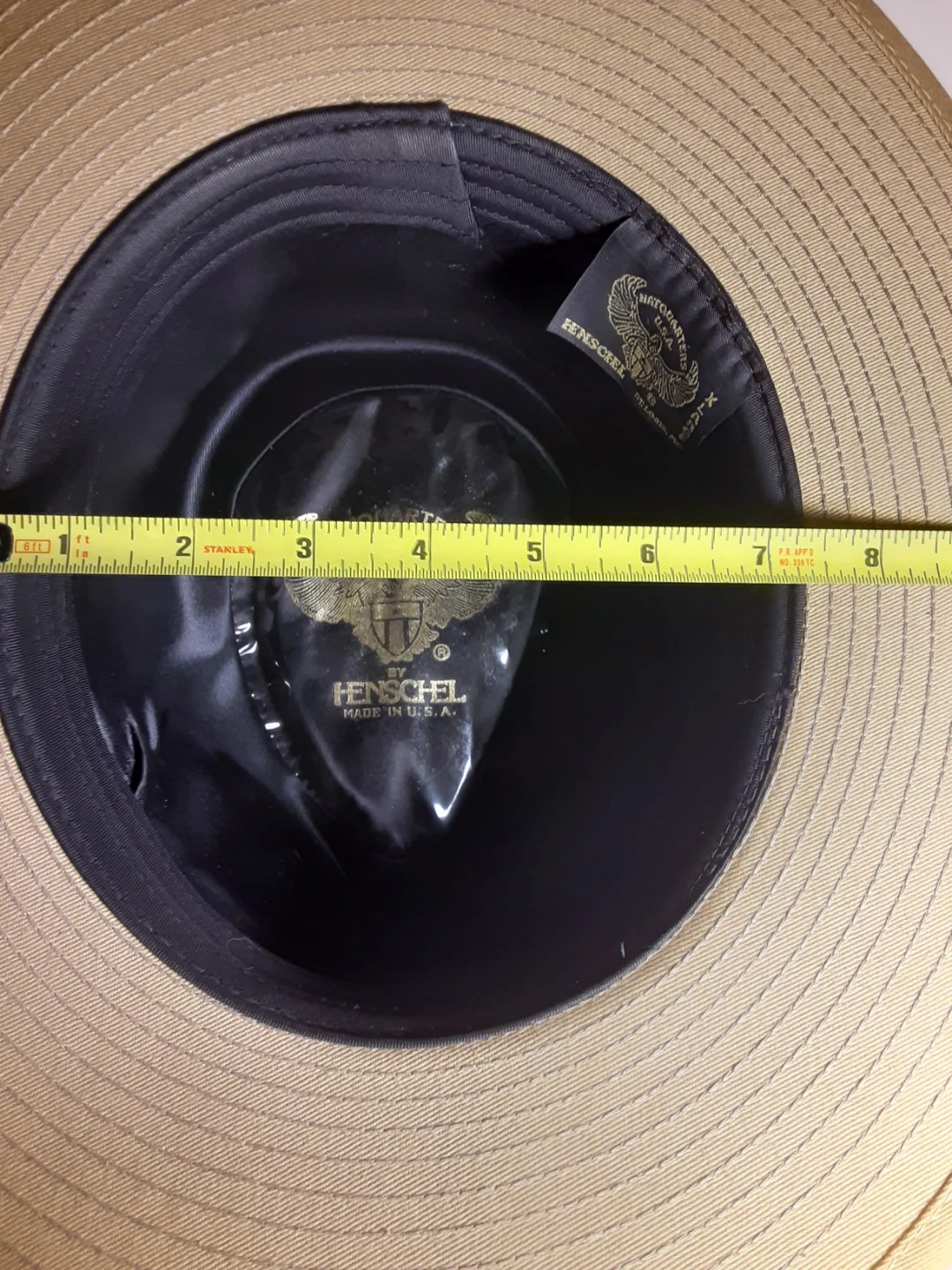 Extra large vintage Henschel Australian Outback(Akubura) Hat, made in the U.S.A. Has some signs of use/damage. Make sure to check all of the images very thoroughly. Tan colour with light brown(leather) accent ribbon.