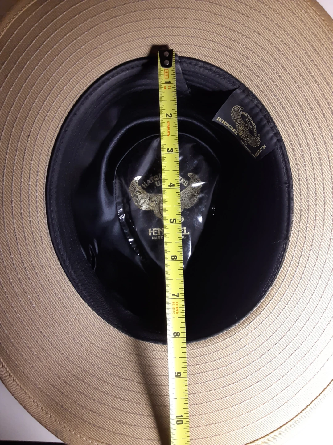 Extra large vintage Henschel Australian Outback(Akubura) Hat, made in the U.S.A. Has some signs of use/damage. Make sure to check all of the images very thoroughly. Tan colour with light brown(leather) accent ribbon.