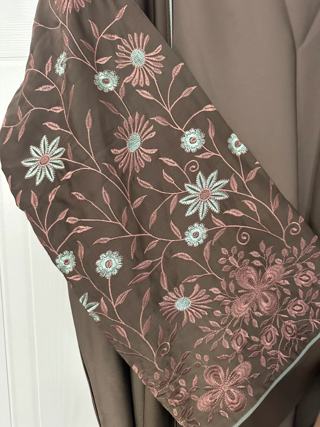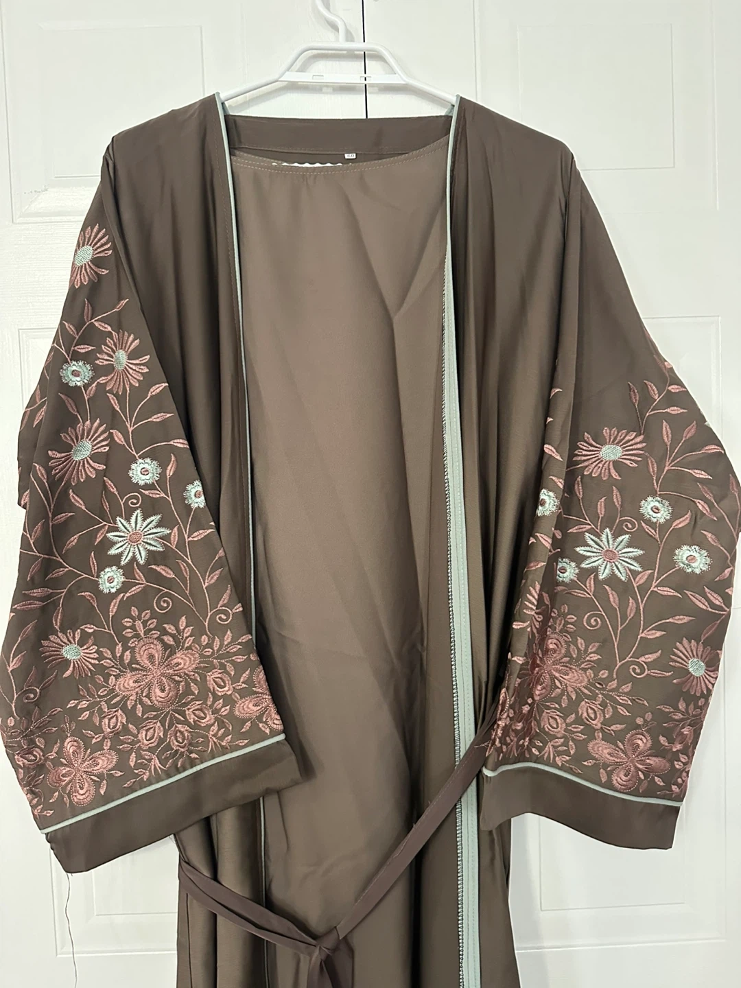 Elegant brown kimono abaya featuring intricate pink and blue floral embroidery on the sleeves and bottom border all around front and back. Lightweight and flowy design for comfortable wear. Classic open-front silhouette with coordinating trim. Subtle pink embroidery adds a feminine touch to the brown base.