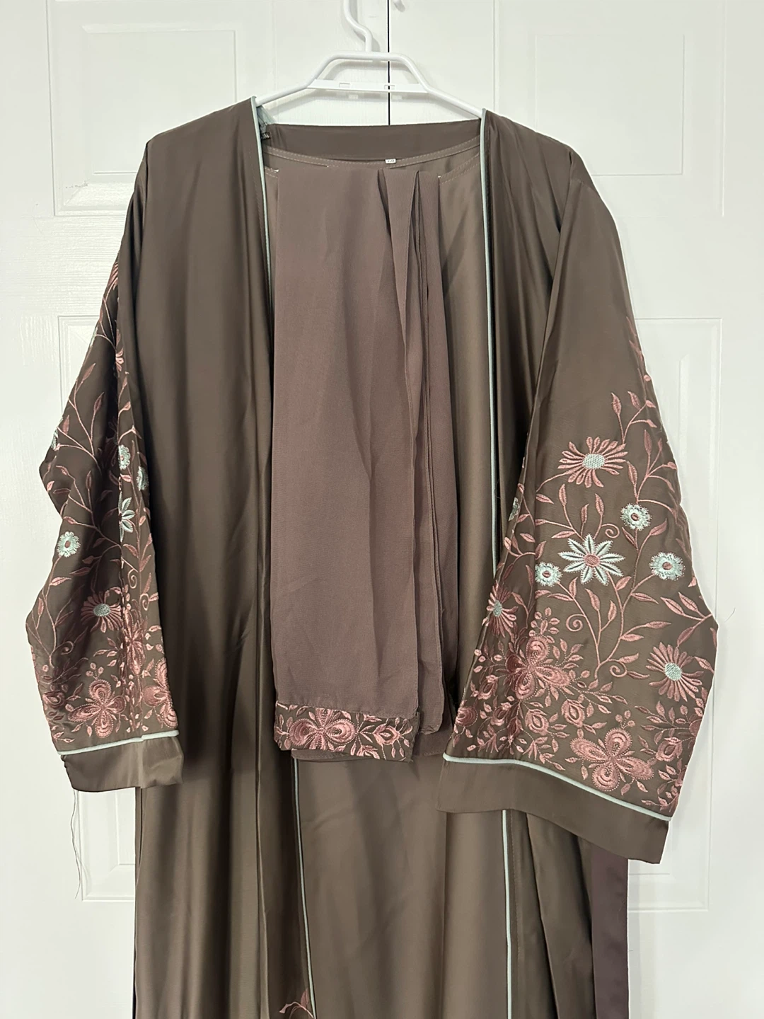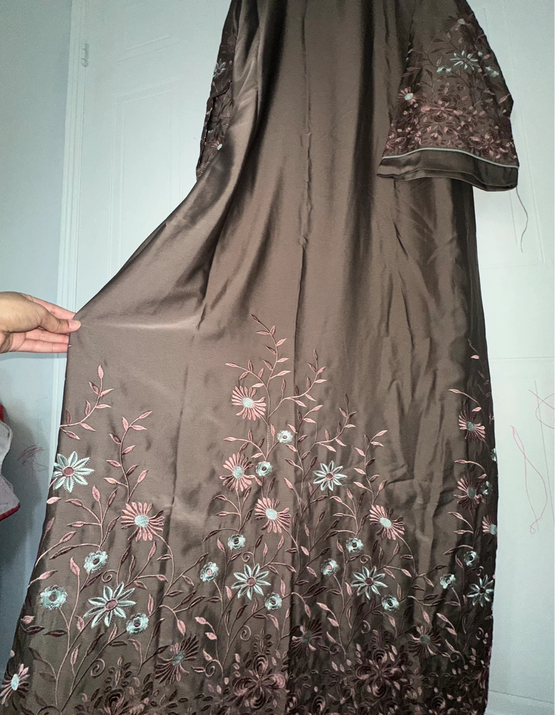 Elegant brown kimono abaya featuring intricate pink and blue floral embroidery on the sleeves and bottom border all around front and back. Lightweight and flowy design for comfortable wear. Classic open-front silhouette with coordinating trim. Subtle pink embroidery adds a feminine touch to the brown base.