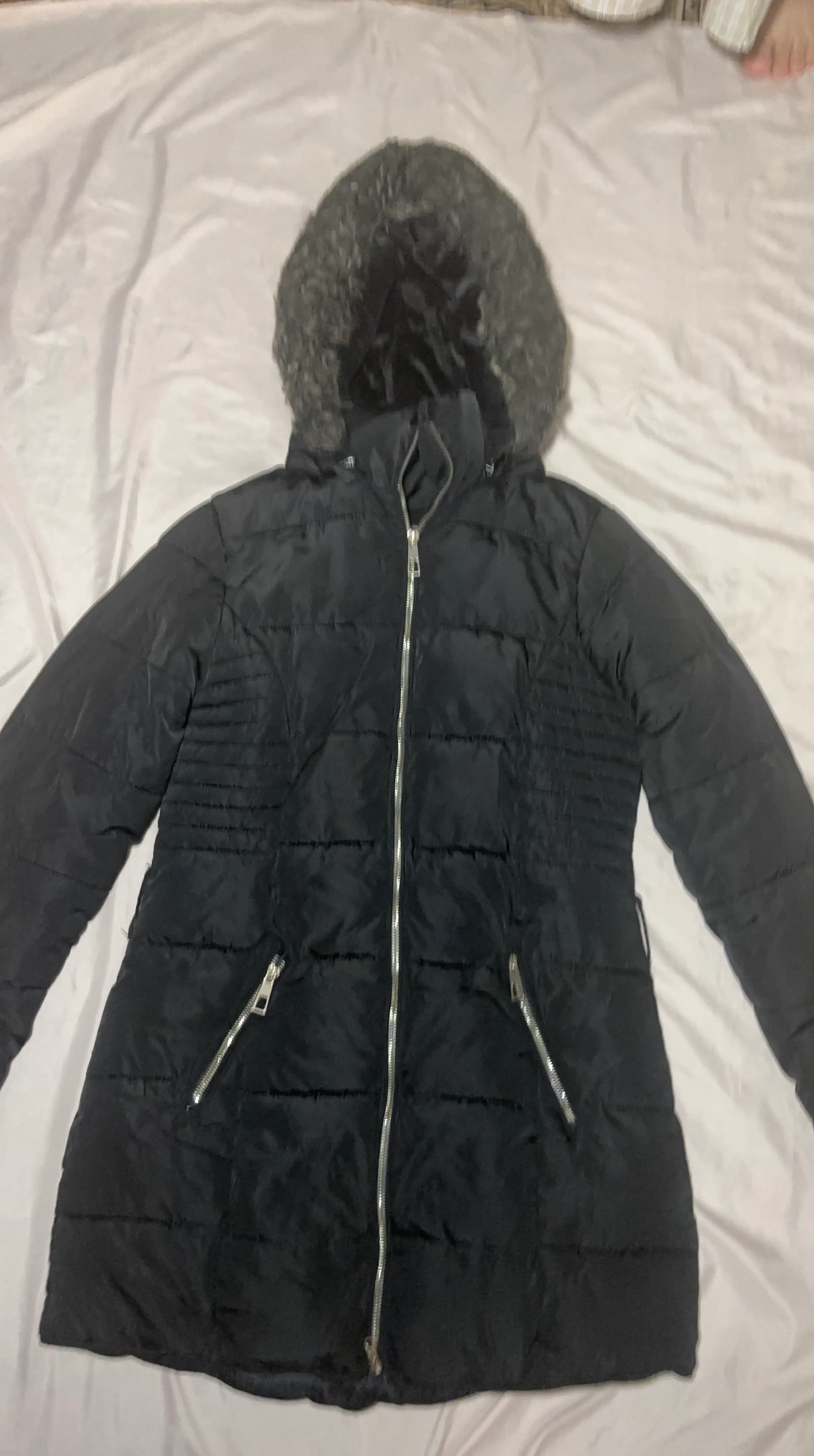 This black puffer jacket features a cozy faux fur-lined hood and a full zip-up front. It has two zippered hand pockets on the front. Its quilted design offers warmth and style for cooler weather.