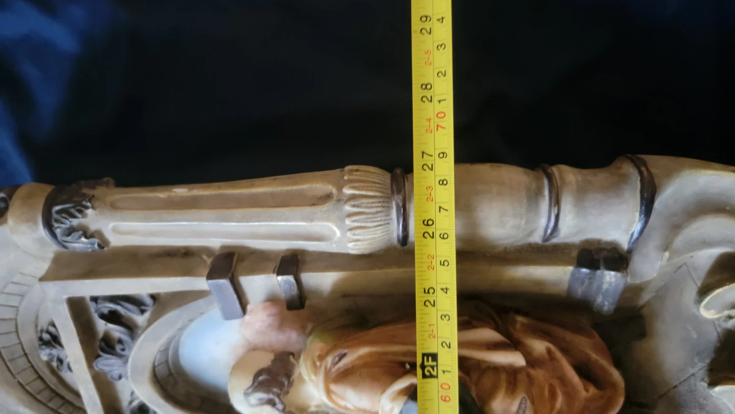 This wall decor depicts The Last Supper scene. It's made of resin with painted details. Measures approximately 27 inches wide, 13 inches tall and 3 inches deep. A striking piece for display!