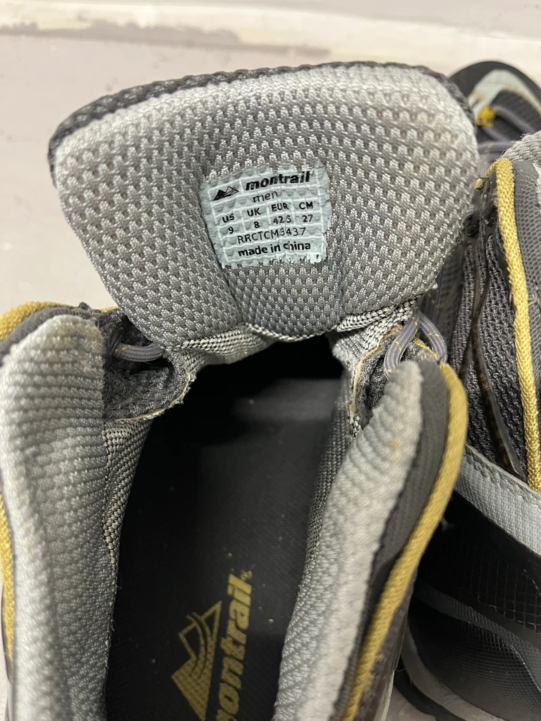 Montrail men's hiking shoes in grey and yellow. US size 9, UK 8, EUR 42.5, CM 27. These shoes are built for the trail!