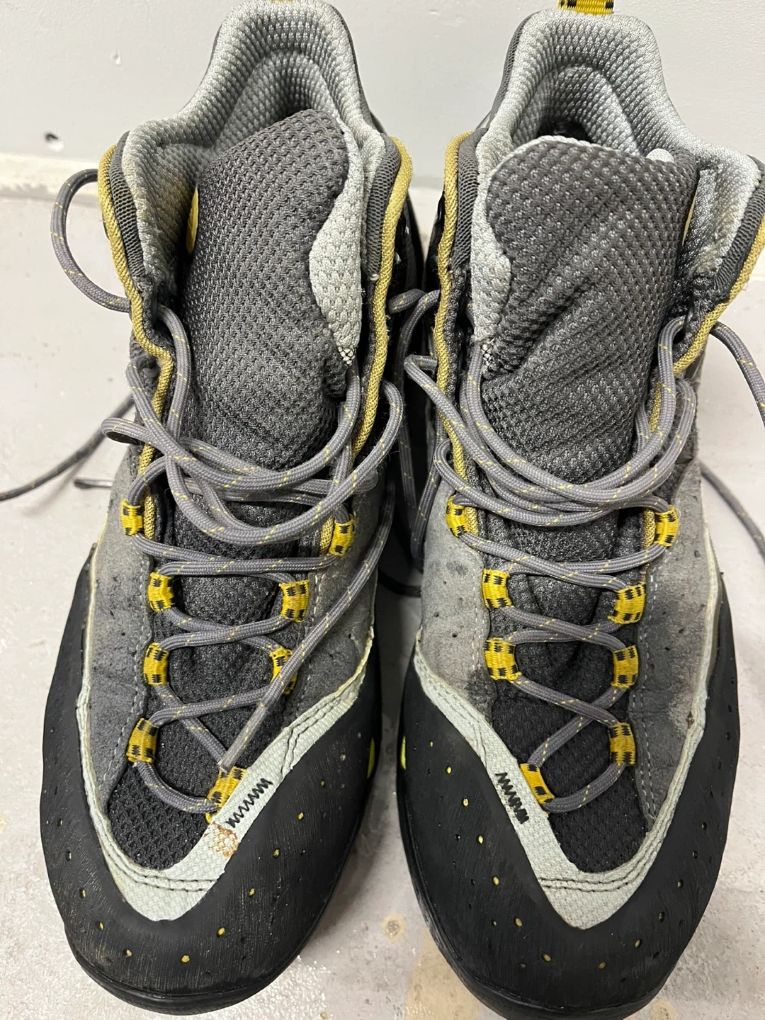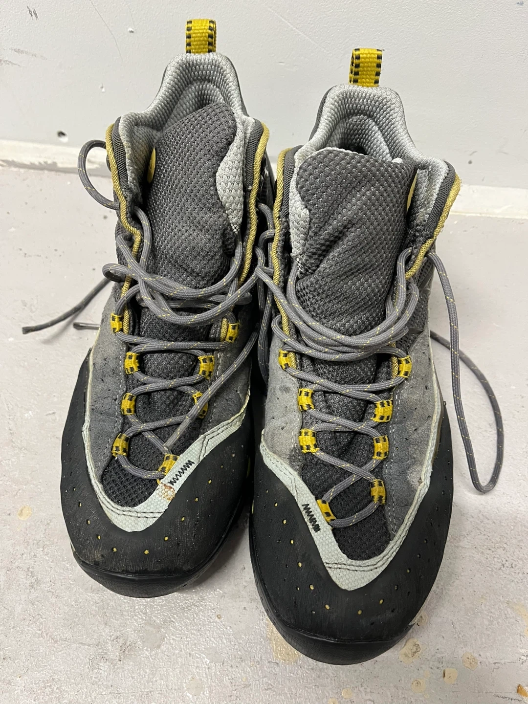 Montrail men's hiking shoes in grey and yellow. US size 9, UK 8, EUR 42.5, CM 27. These shoes are built for the trail!
