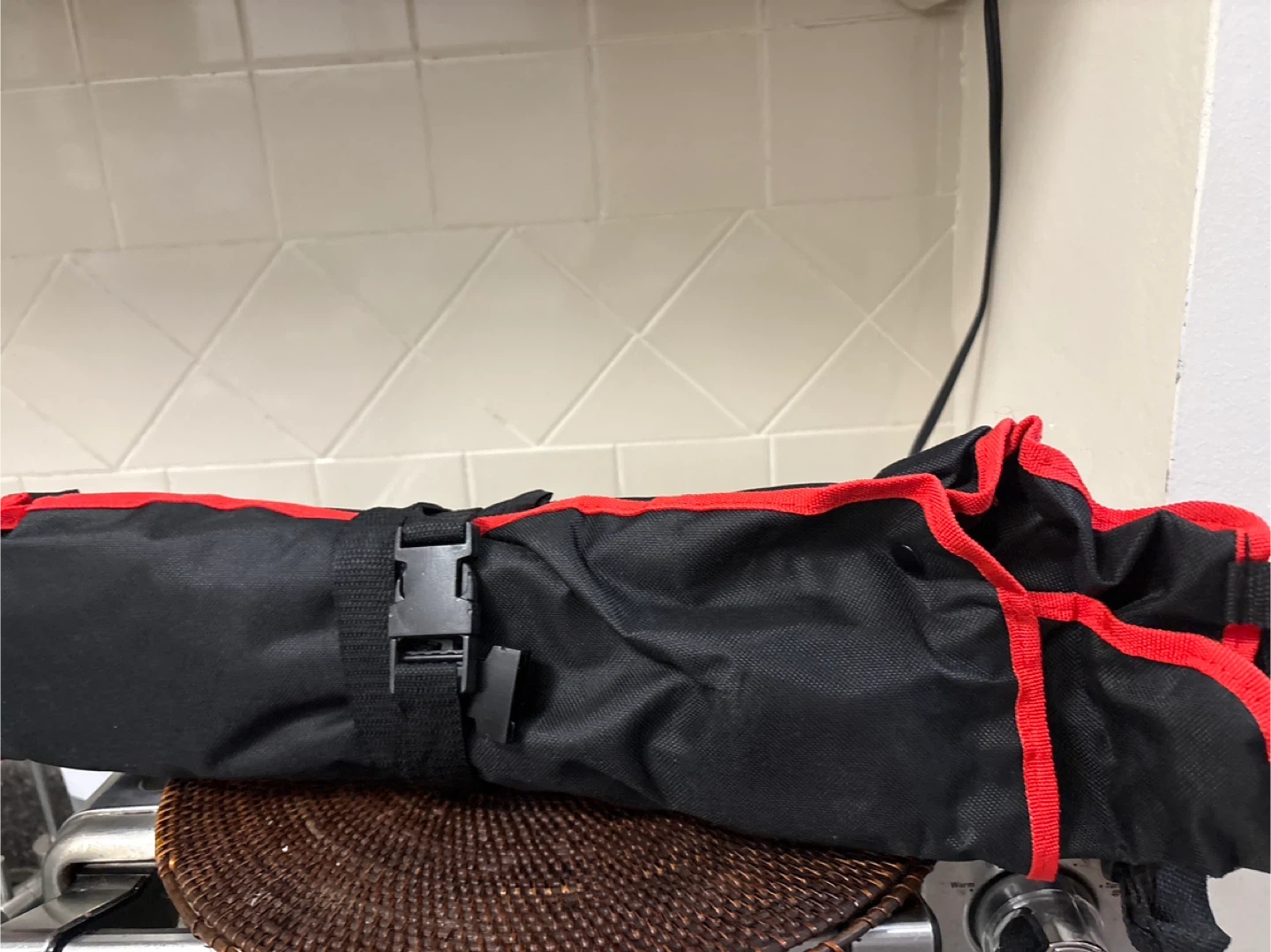 This is a Romertopf 7-piece BBQ tool set. It includes a spatula, tongs, a fork, and 10 skewers, all housed in a black and red roll-up apron. Great for outdoor cooking!
