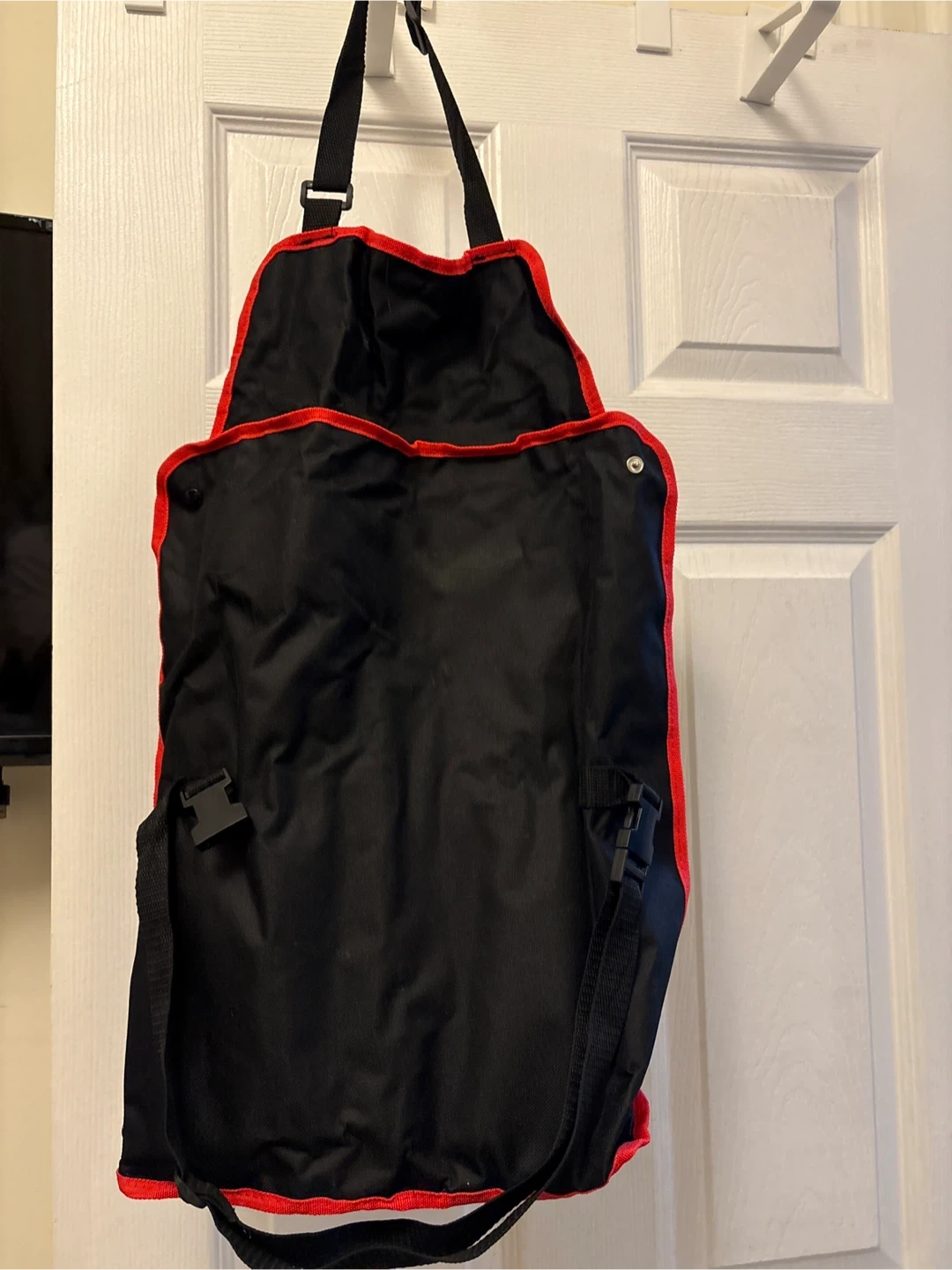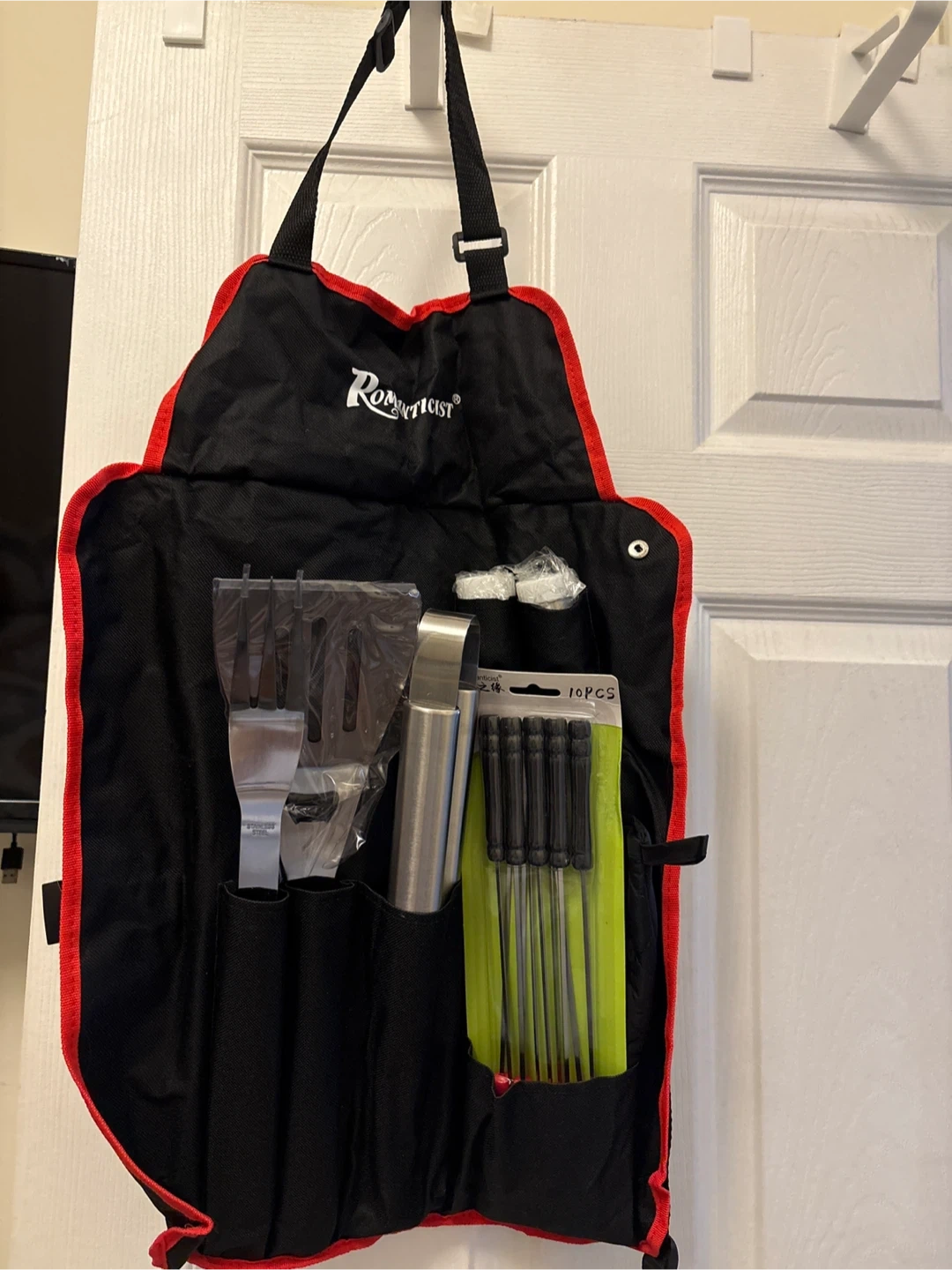 This is a Romertopf 7-piece BBQ tool set. It includes a spatula, tongs, a fork, and 10 skewers, all housed in a black and red roll-up apron. Great for outdoor cooking!