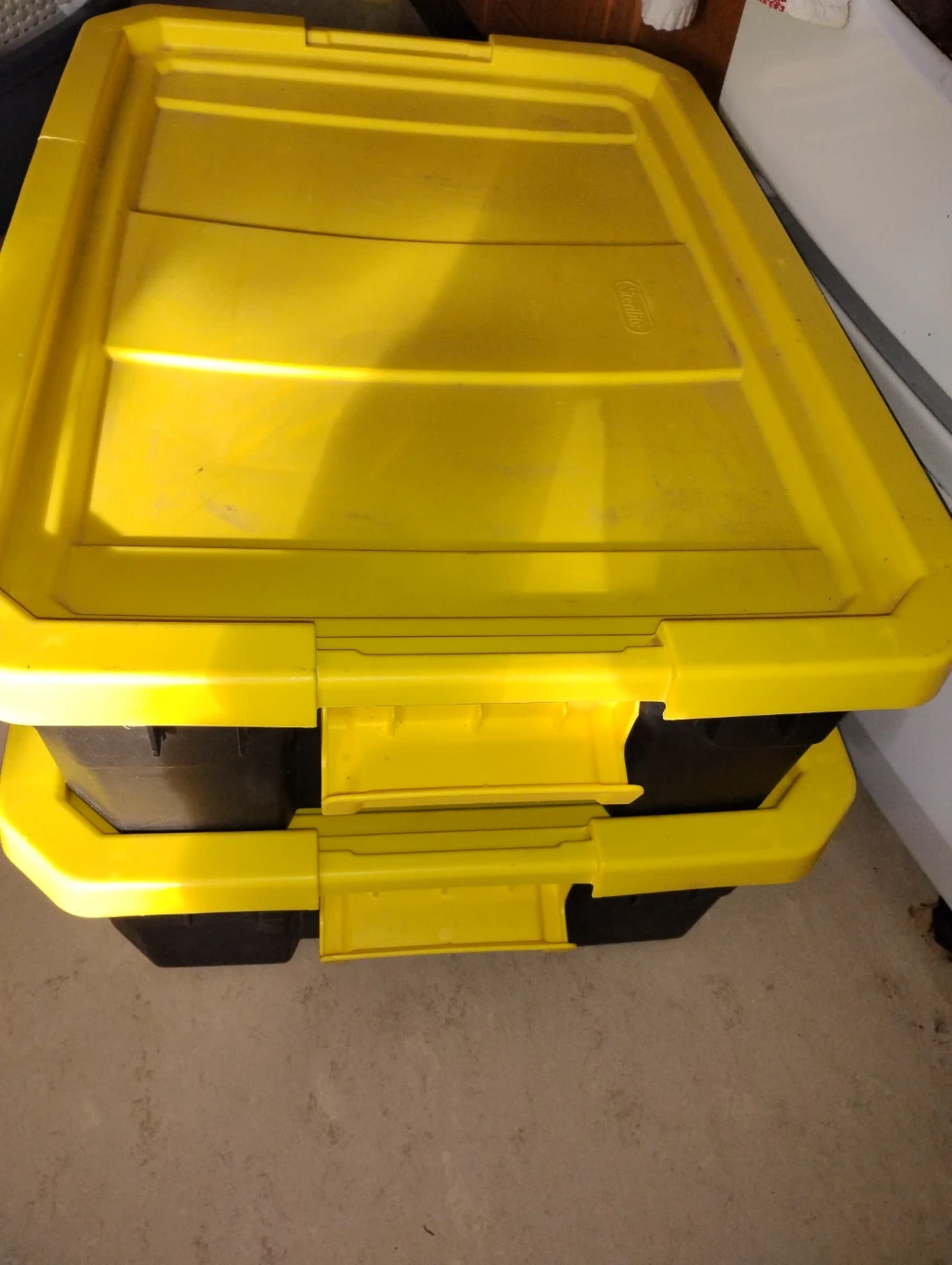 Two Sterilite storage bins in yellow and black. These sturdy totes are great for organizing garages or basements. Plastic material. Hinged lids.