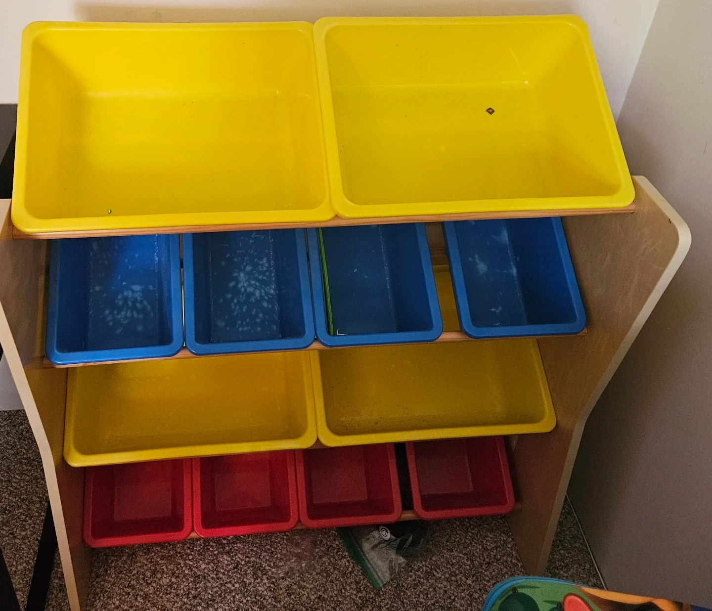 This toy storage organizer features a wooden frame with multiple shelves. It comes with several bins in yellow, blue, and red, perfect for sorting and storing toys. Great for a child's playroom or bedroom!