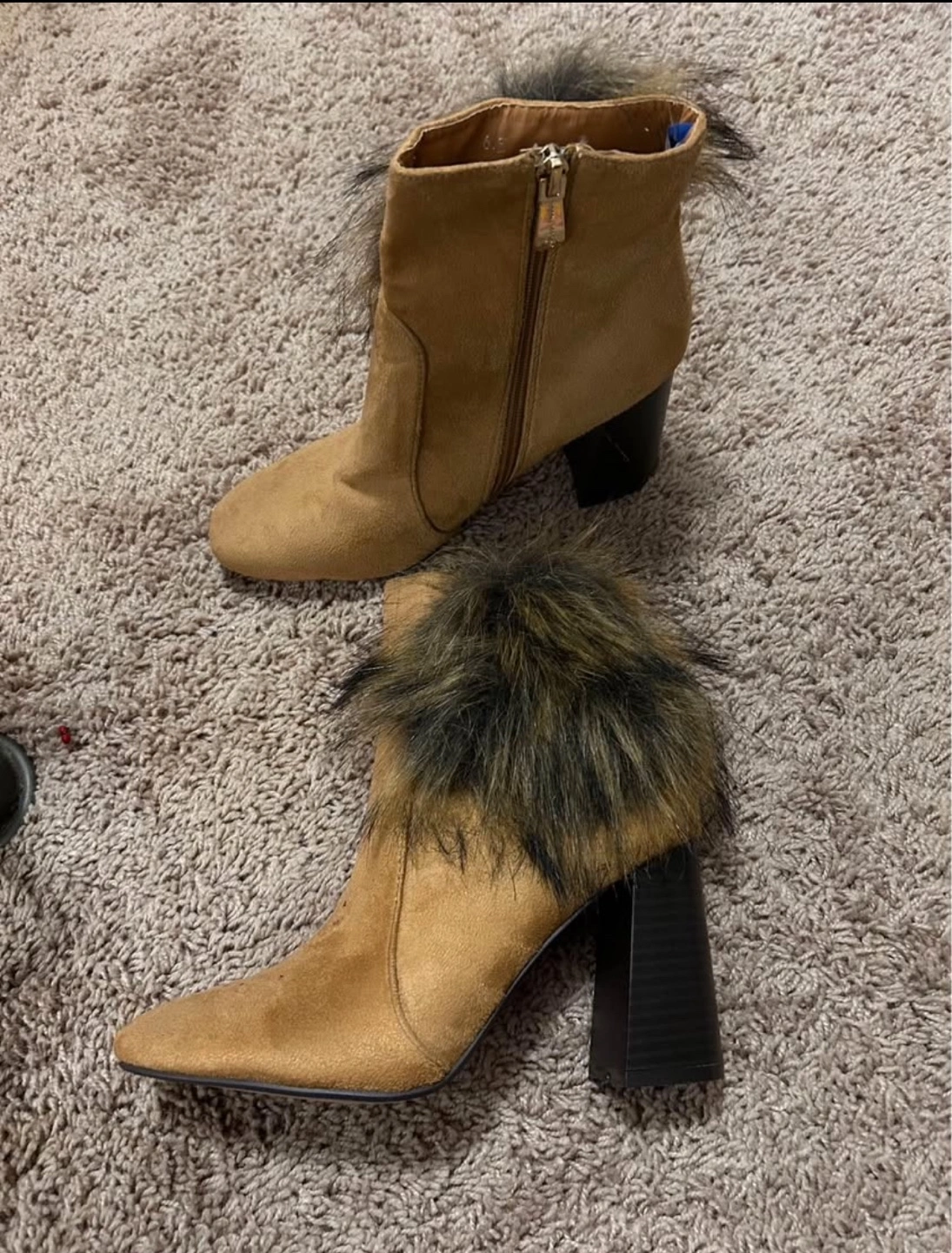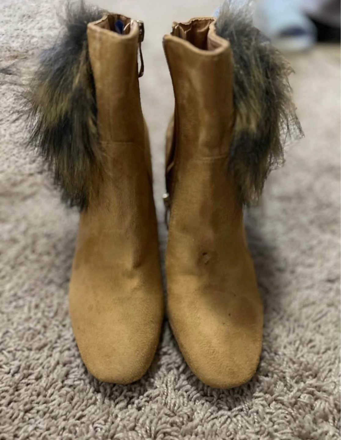 Women's tan suede ankle boots. Block heel. Faux fur accents. Side zipper closure. Great for fall and winter.