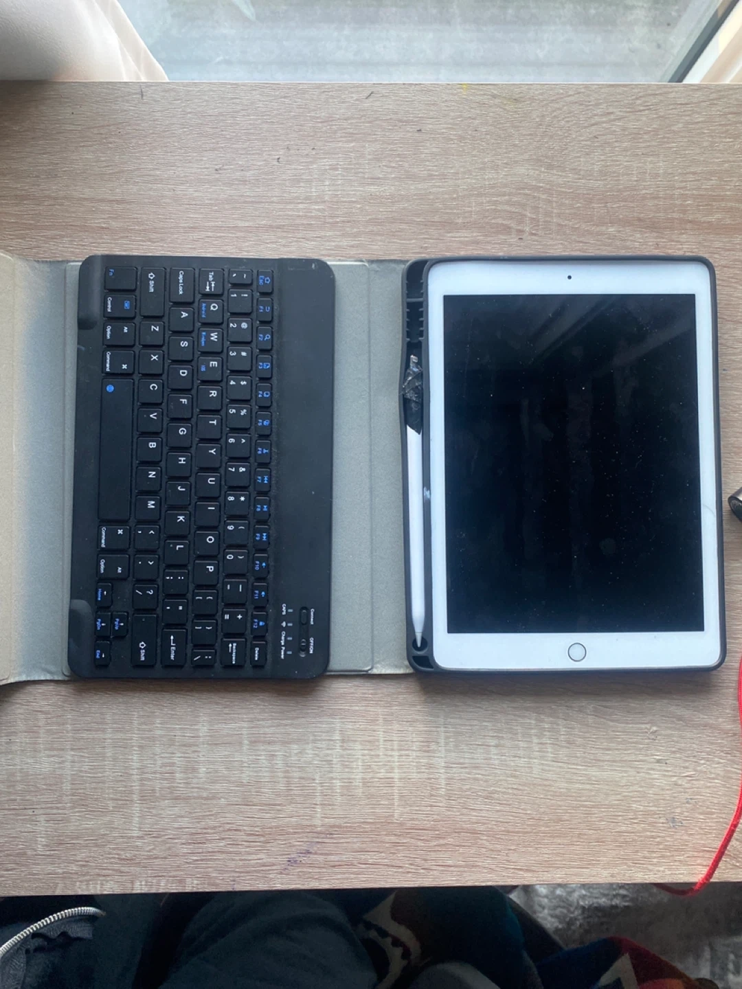 BANKVIEW CALGARY AREA - Apple iPad tablet paired with a black Bluetooth keyboard case. Includes an Apple Pencil with visible damage to the charging end, wrapped in black tape to secure it, but it still charges fine and works fine. ipad is fully reset and ready to go. doesnt come with pencil accessories or chargers etc. exactly how shown in photos. ipad runs great, older model so it does die a little faster than new ones but still lasts about 4 hours before it needs to be plugged in