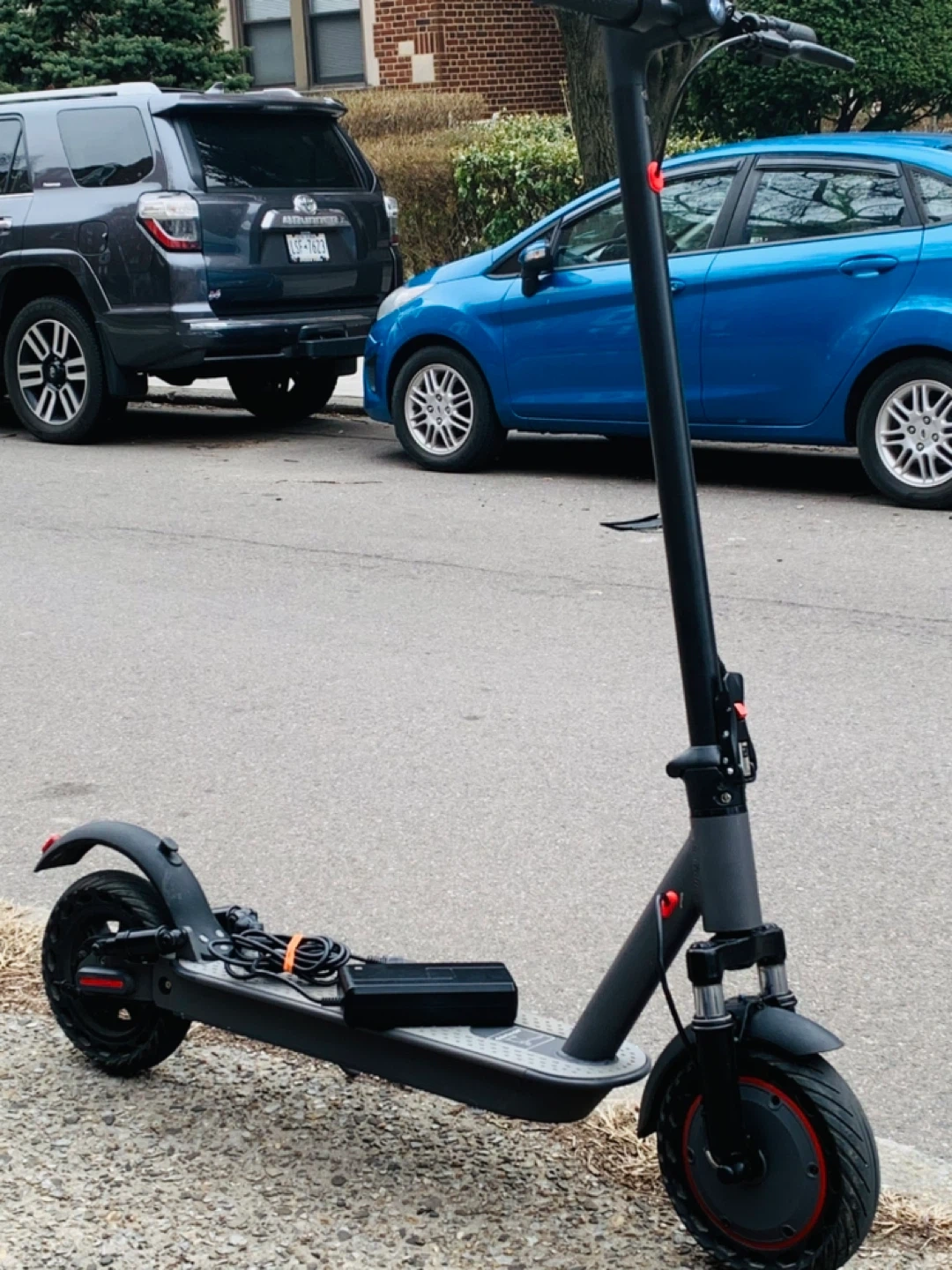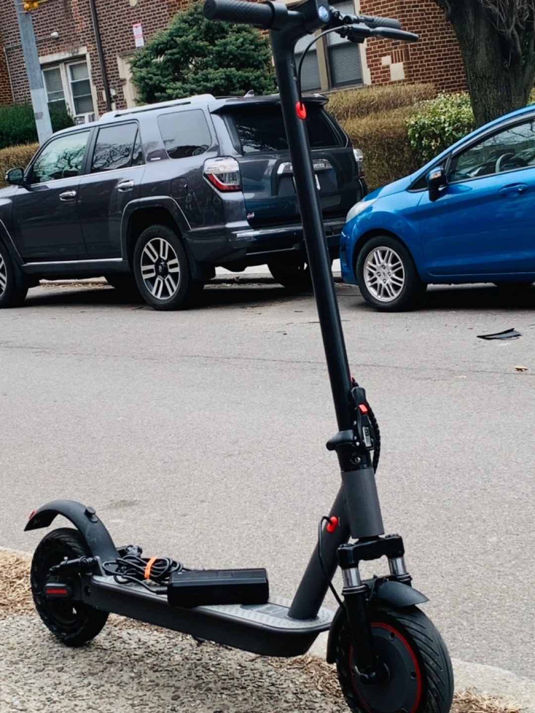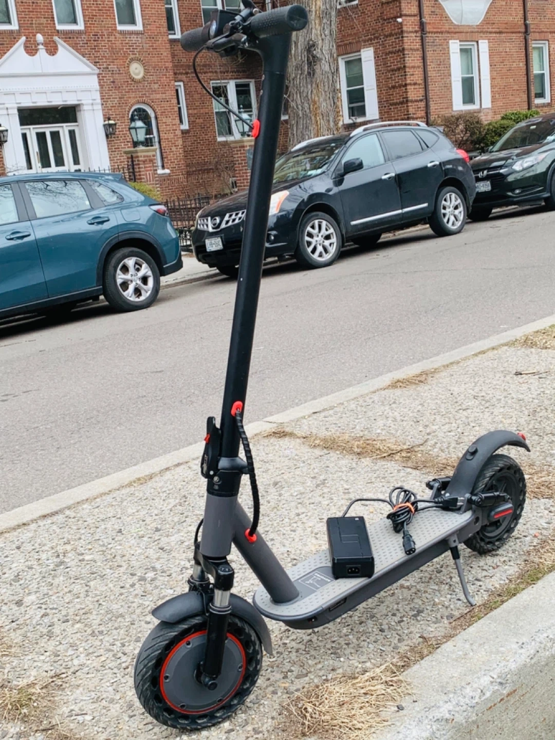 Gray electric scooter with a charger included. It has a foldable design and a light on the handlebars. This scooter brand. New run fast 35MPH big scooter 10 inches wells rubber tires 40 miles range foldable scooter easy to carry bus train high quality waterproof heavy duty have good suspension observe ll shocks everything works 100% no issue