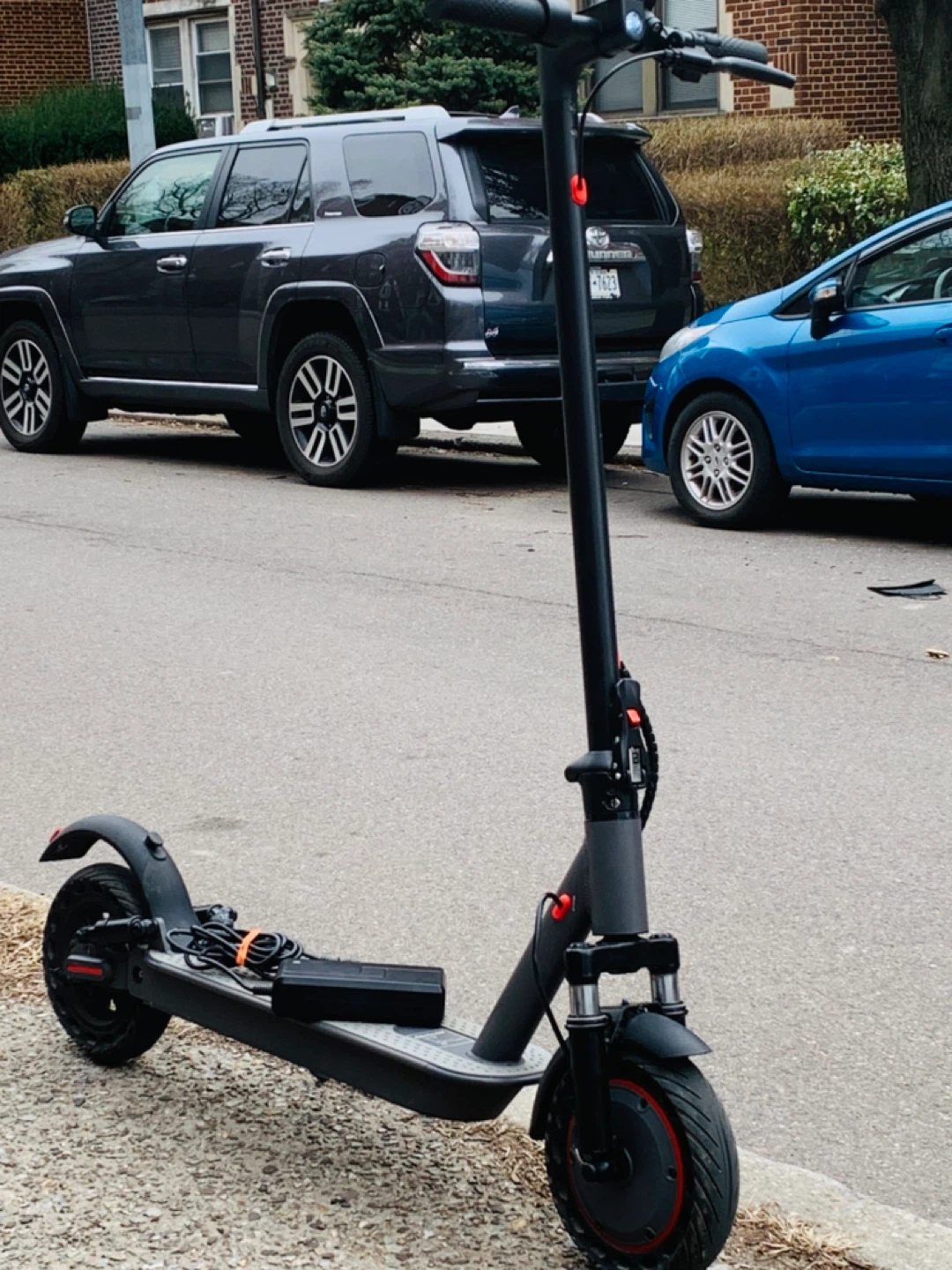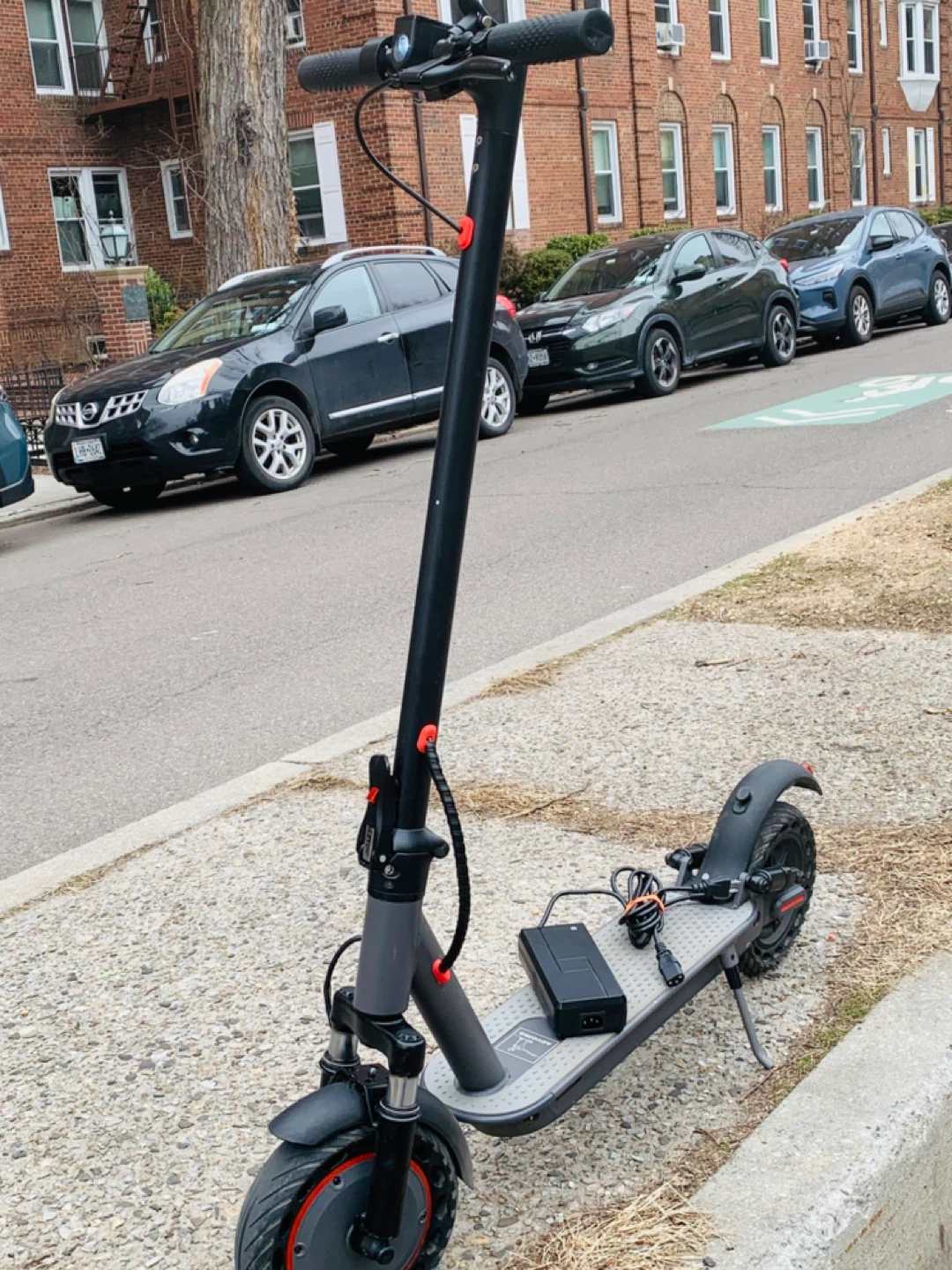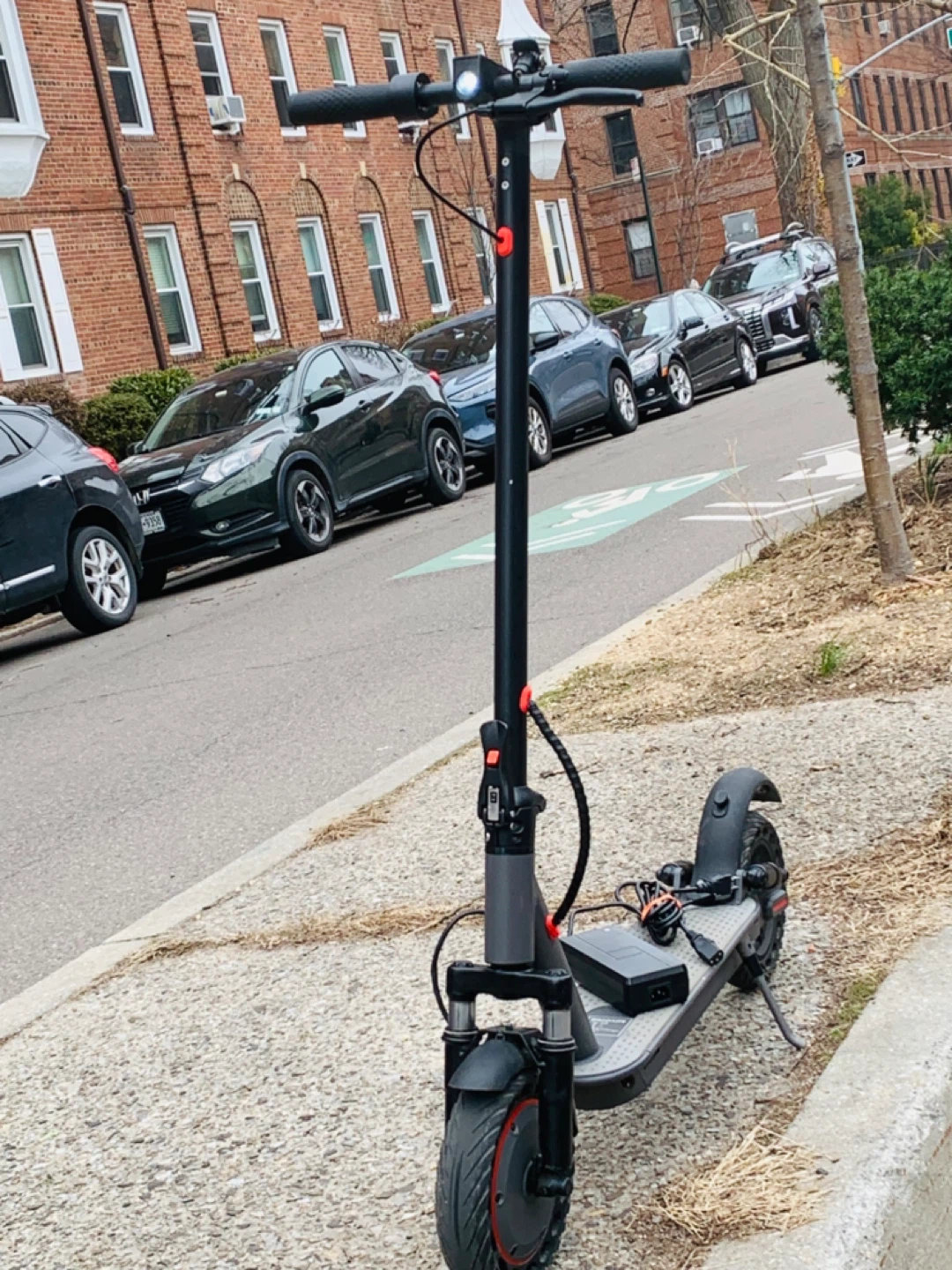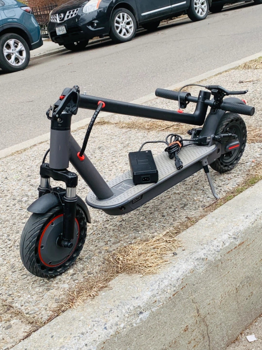 Gray electric scooter with a charger included. It has a foldable design and a light on the handlebars. This scooter brand. New run fast 35MPH big scooter 10 inches wells rubber tires 40 miles range foldable scooter easy to carry bus train high quality waterproof heavy duty have good suspension observe ll shocks everything works 100% no issue