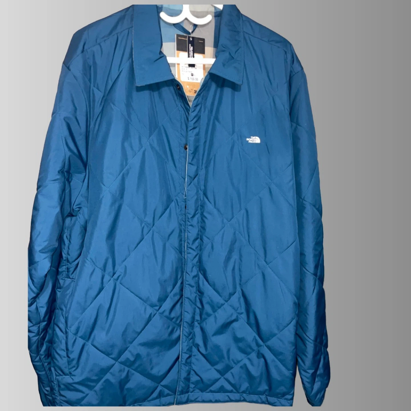 Reversible insulated jacket from The North Face. One side features a plaid pattern in blues and beige, and the other is a solid deep blue with quilted stitching. This jacket is labelled size XL. It's a great layering piece for cooler weather!