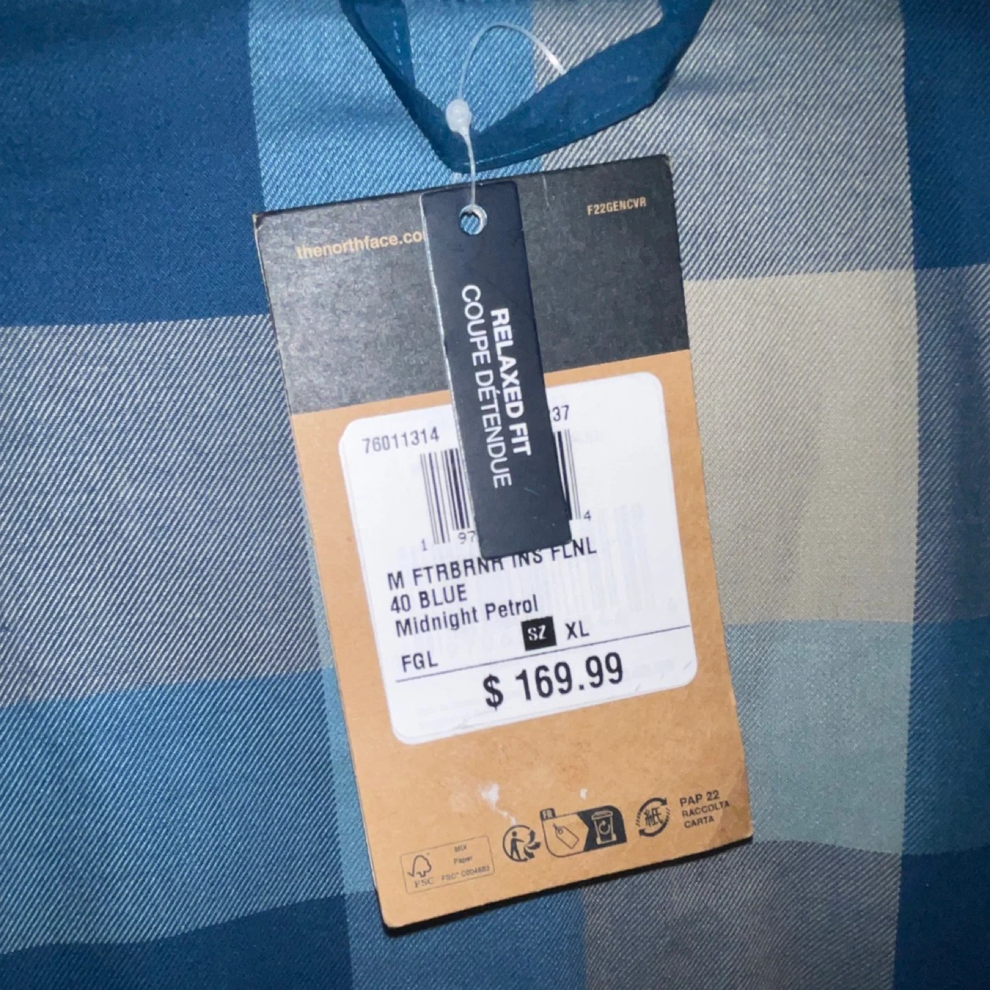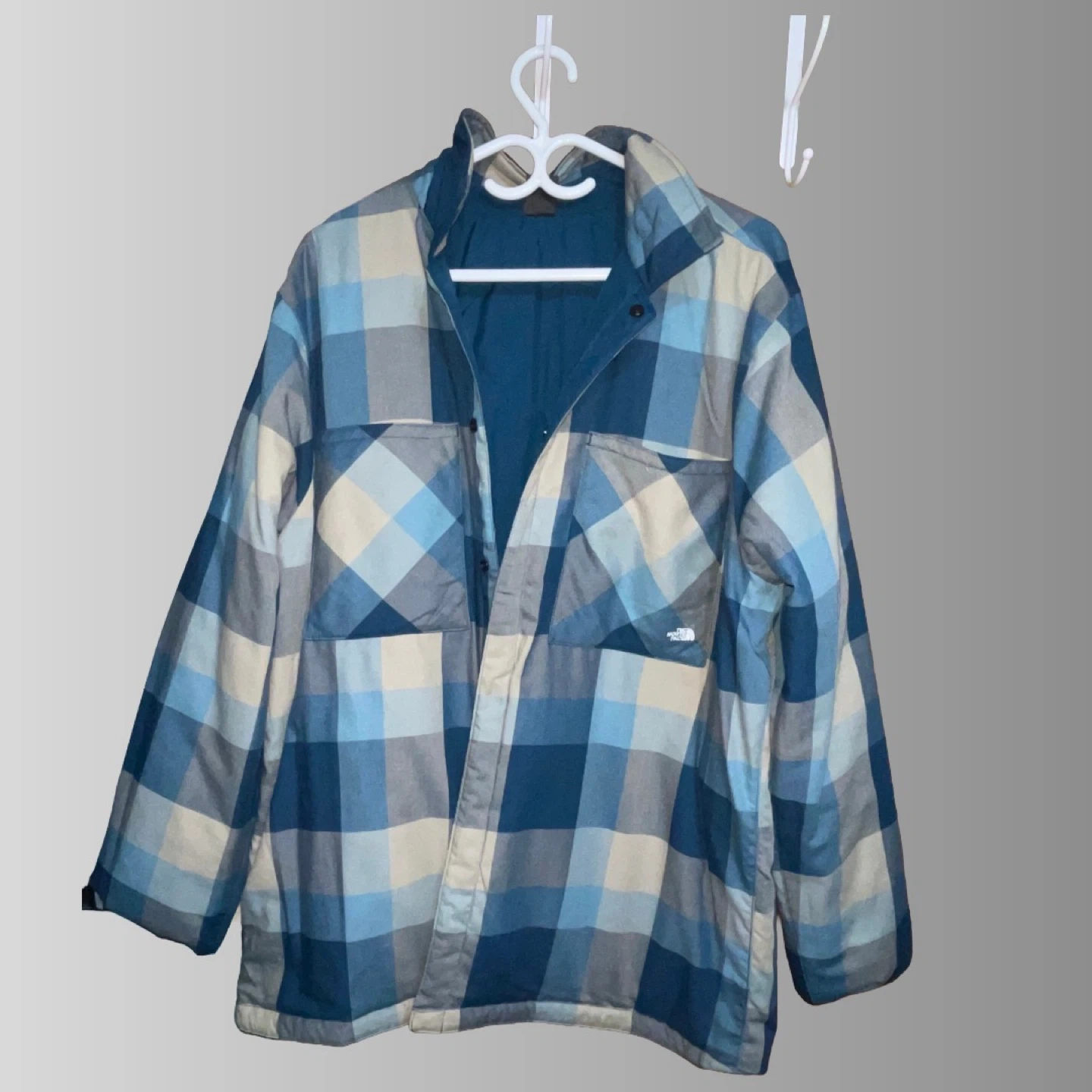 Reversible insulated jacket from The North Face. One side features a plaid pattern in blues and beige, and the other is a solid deep blue with quilted stitching. This jacket is labelled size XL. It's a great layering piece for cooler weather!