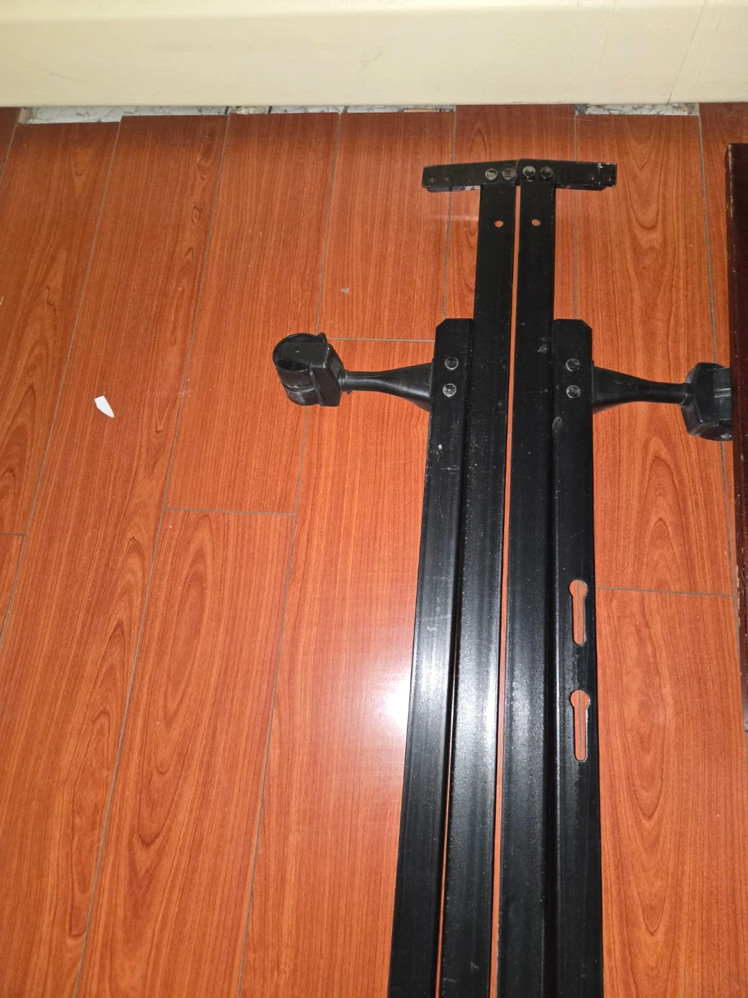 This is a set of black metal brackets for a bed frame . It's made of durable metal with wheels for easy positioning. Must have car to pick up