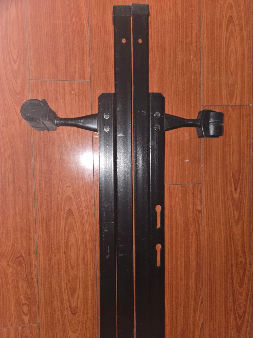 This is a set of black metal brackets for a bed frame . It's made of durable metal with wheels for easy positioning. Must have car to pick up