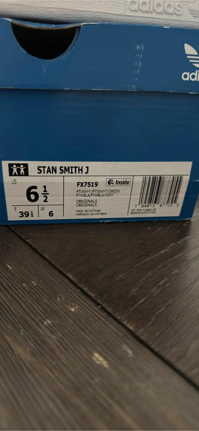 Selling a pair of Adidas Stan Smith J sneakers in white with green accents! They are a youth size 6.5. Comes with the original box