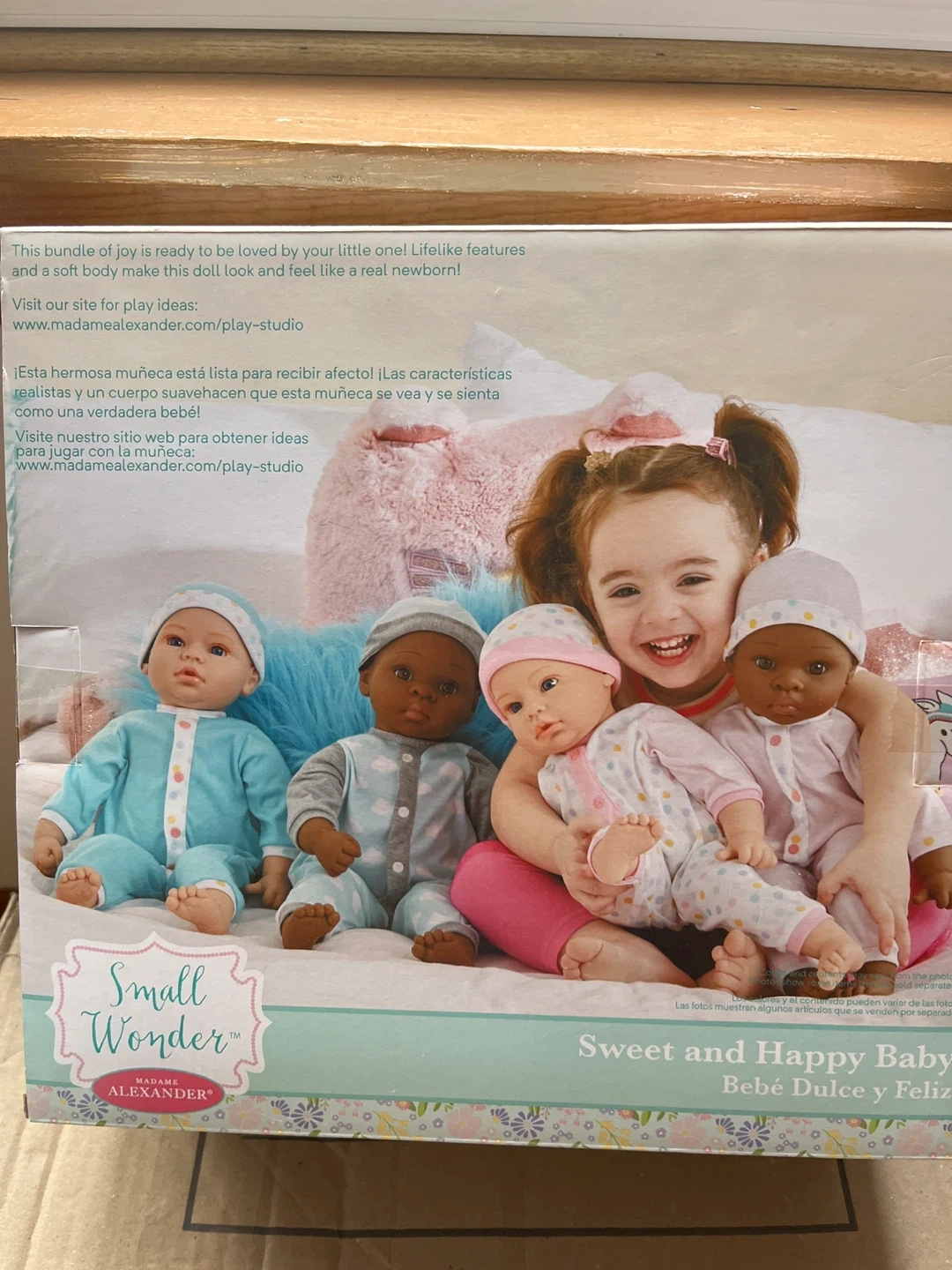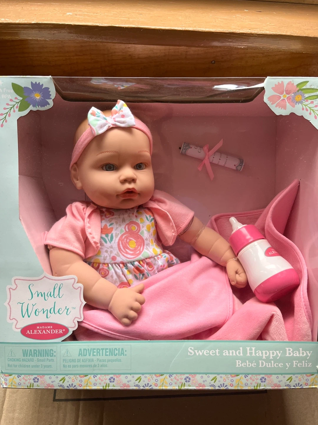 This Madame Alexander Small Wonder doll is ready for cuddles! It's a Sweet and Happy Baby doll with a cute outfit and accessories. This doll is recommended for children 3 years and older.
