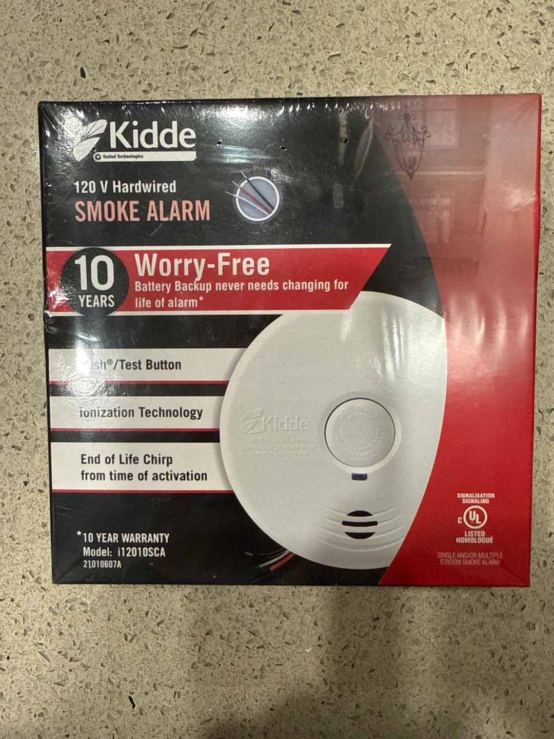 This Kidde smoke alarm is hardwired and features battery backup that never needs changing. It utilizes ionization technology and has an end-of-life chirp from activation. This model has a 10-year warranty.