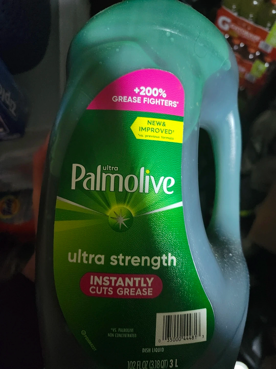 Selling a bottle of Palmolive Ultra Strength dish liquid. This has +200% grease fighters and instantly cuts grease. It's new and improved compared to the previous formula. The bottle contains 102 fl oz (3.18 QT) 3 L of dish liquid