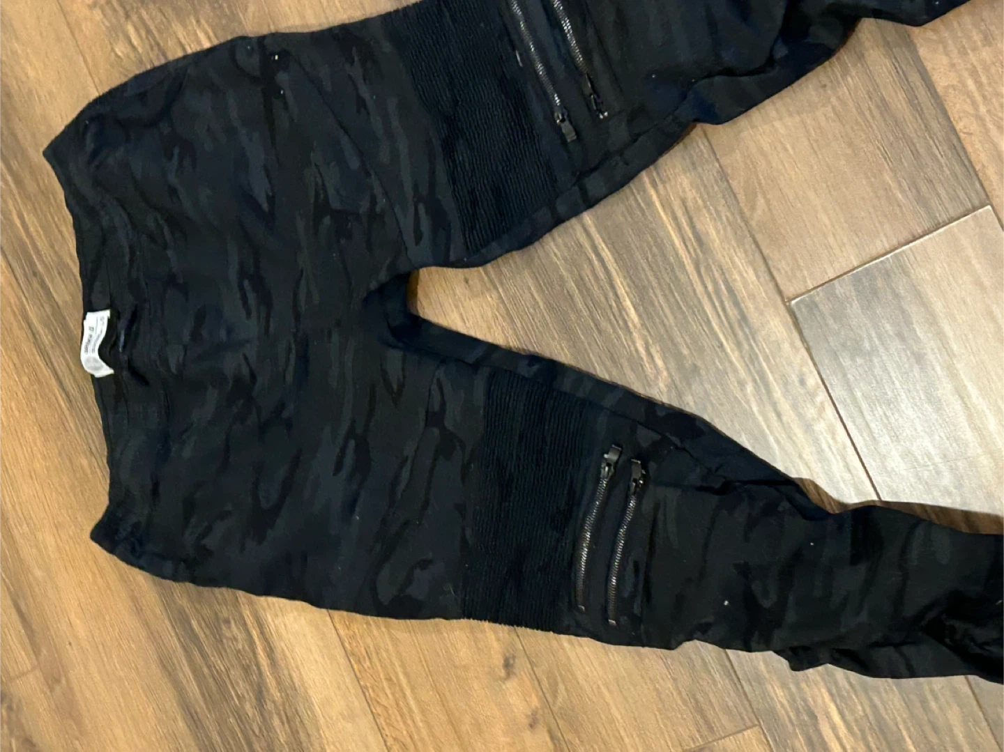These URBAN ID jogger pants feature a black camouflage pattern. They're designed with zippered accents for a stylish look. Size is large.