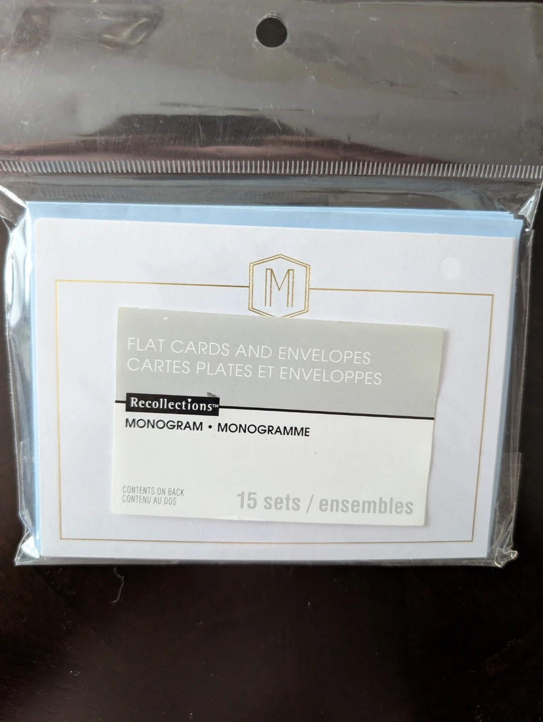 This is a set of Recollections flat cards and envelopes. It includes 15 monogrammed sets, printed with a letter M. These cards are suitable for sending notes or invitations.
