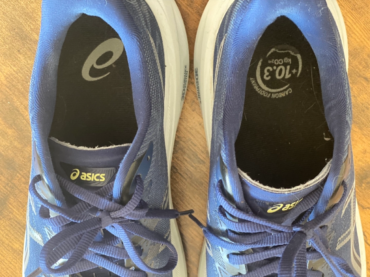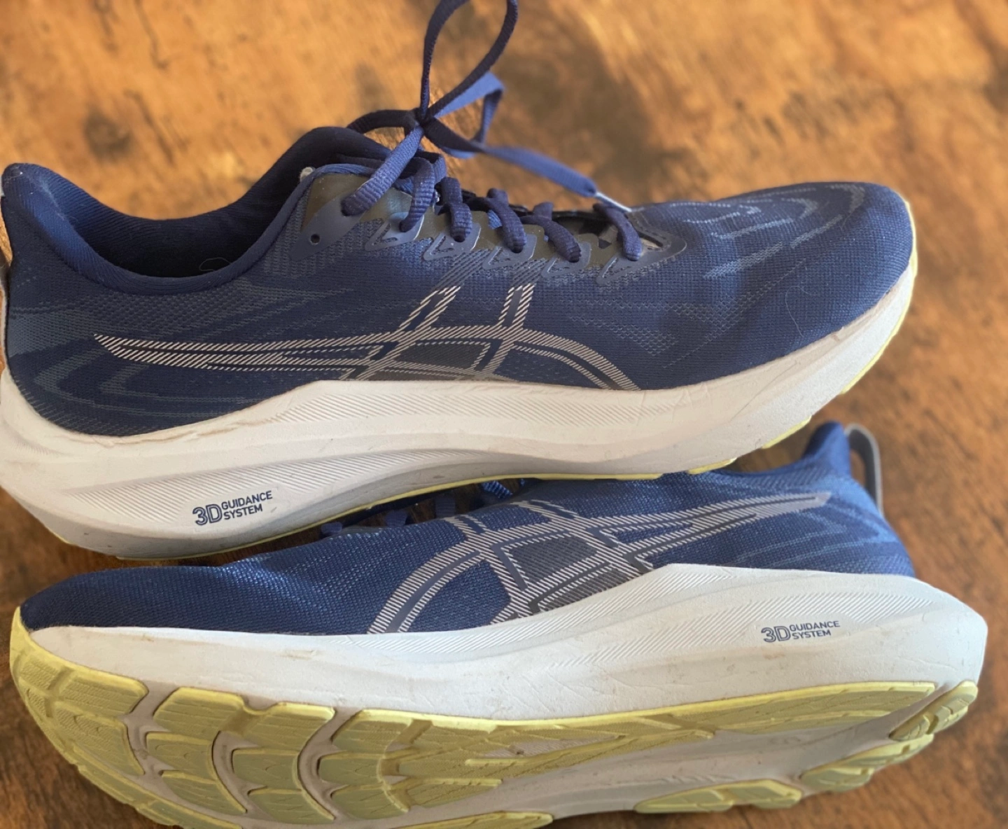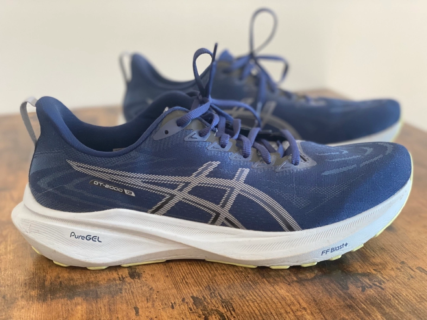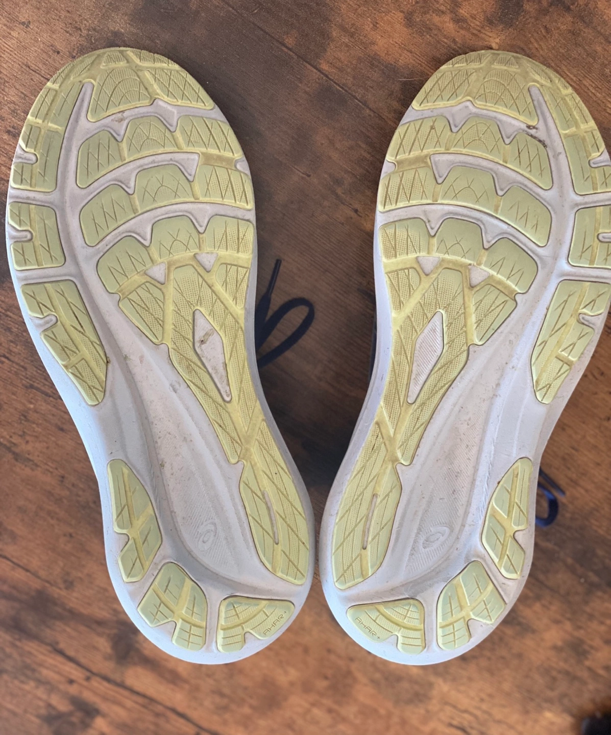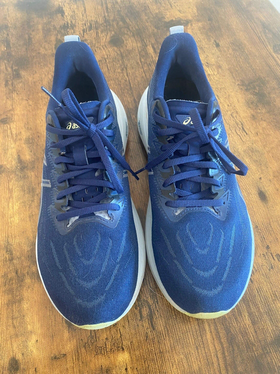 Women's running shoes. Navy blue with white and yellow accents. Good condition. Features PureGEL and FF BLAST+ cushioning. 3D Guidance System.