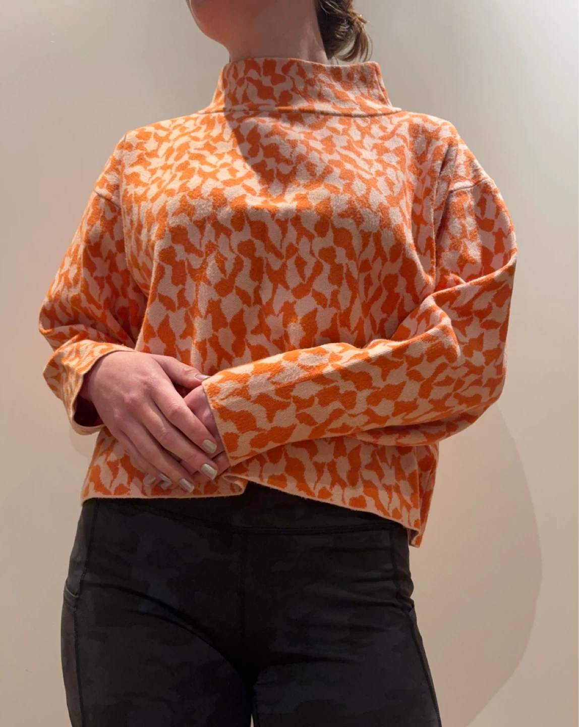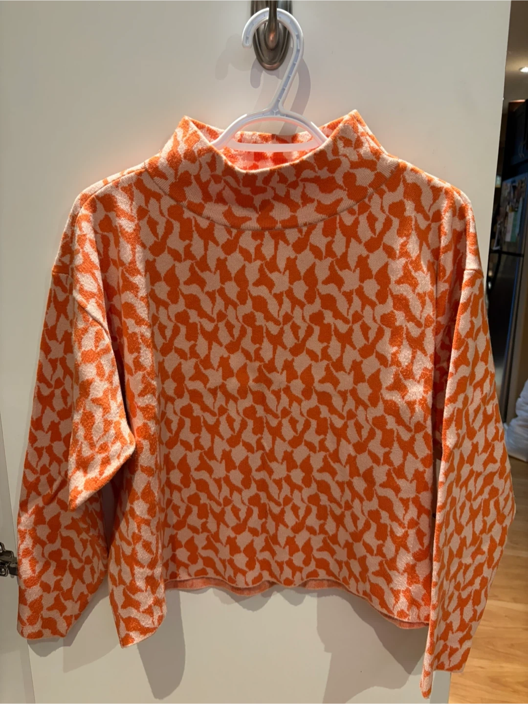 Size small and features an all-over orange and cream abstract pattern. The knit material makes it cozy for cooler days!
